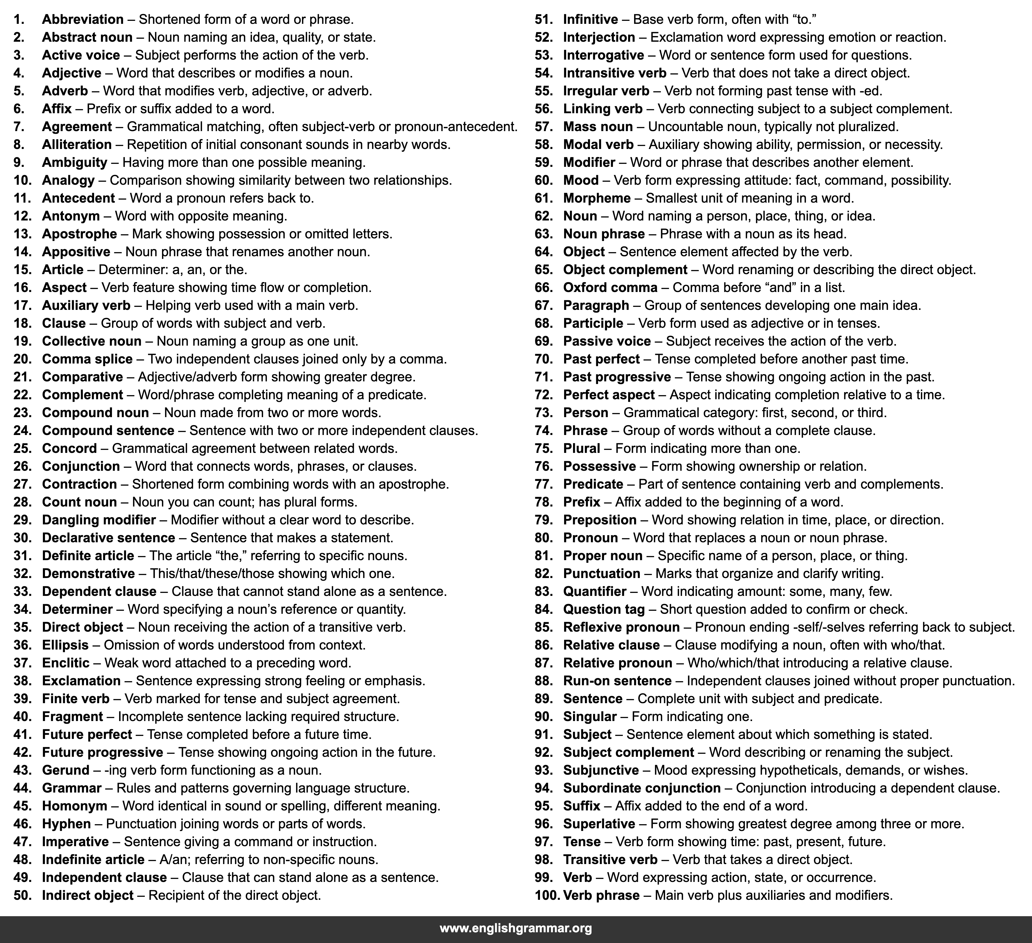 | 98. | Transitive verb | Verb that takes a direct object. |