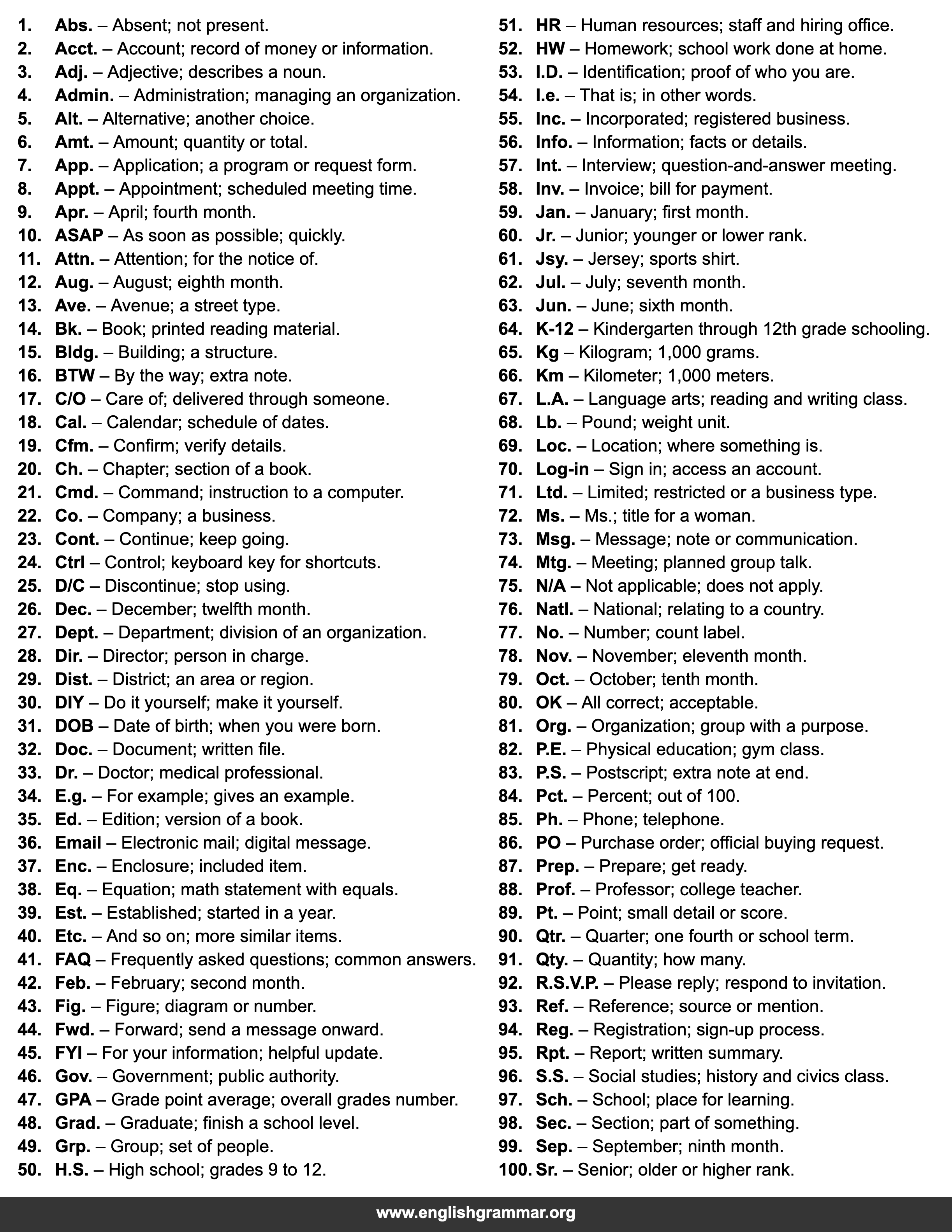 | 100. | Sr. | Senior; older or higher rank. |