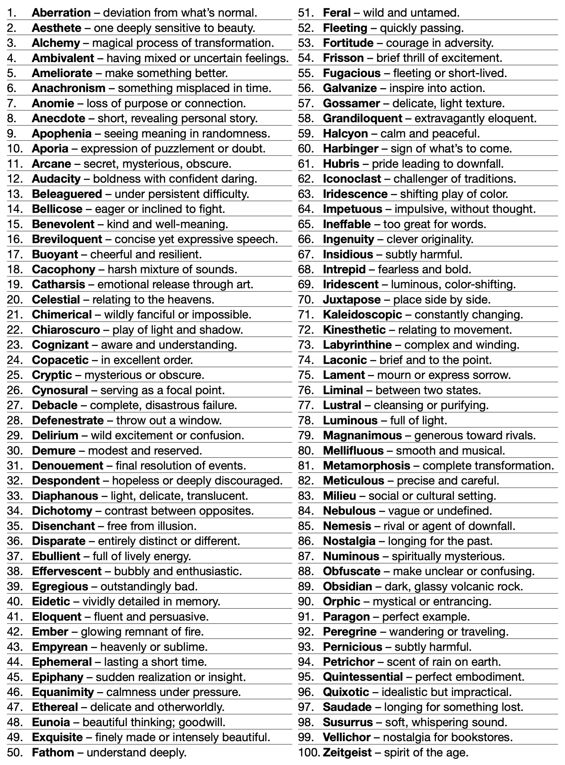 | 99. | Vellichor | Nostalgia for bookstores. |