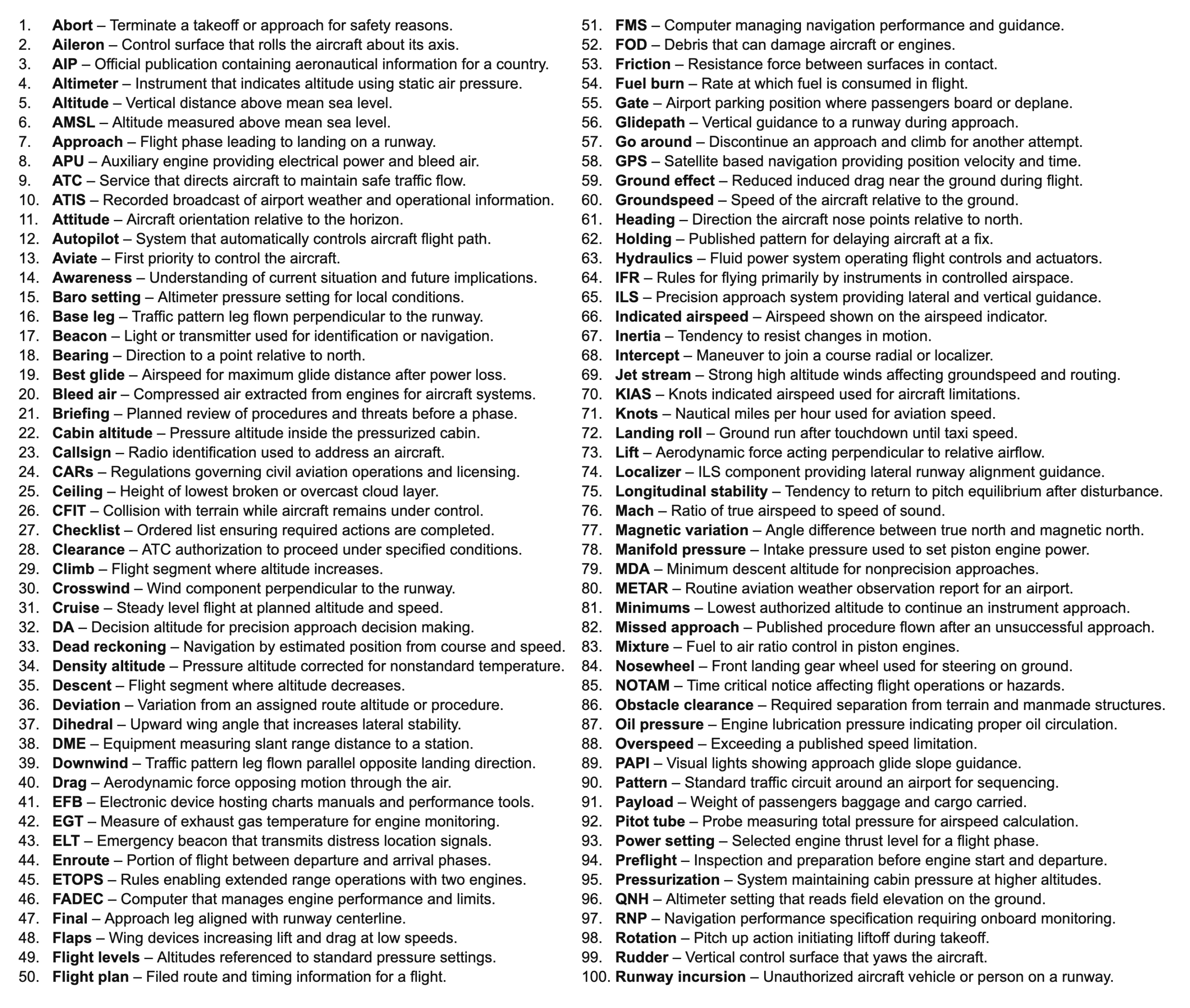 | 1. | Abort | Terminate a takeoff or approach for safety reasons. |