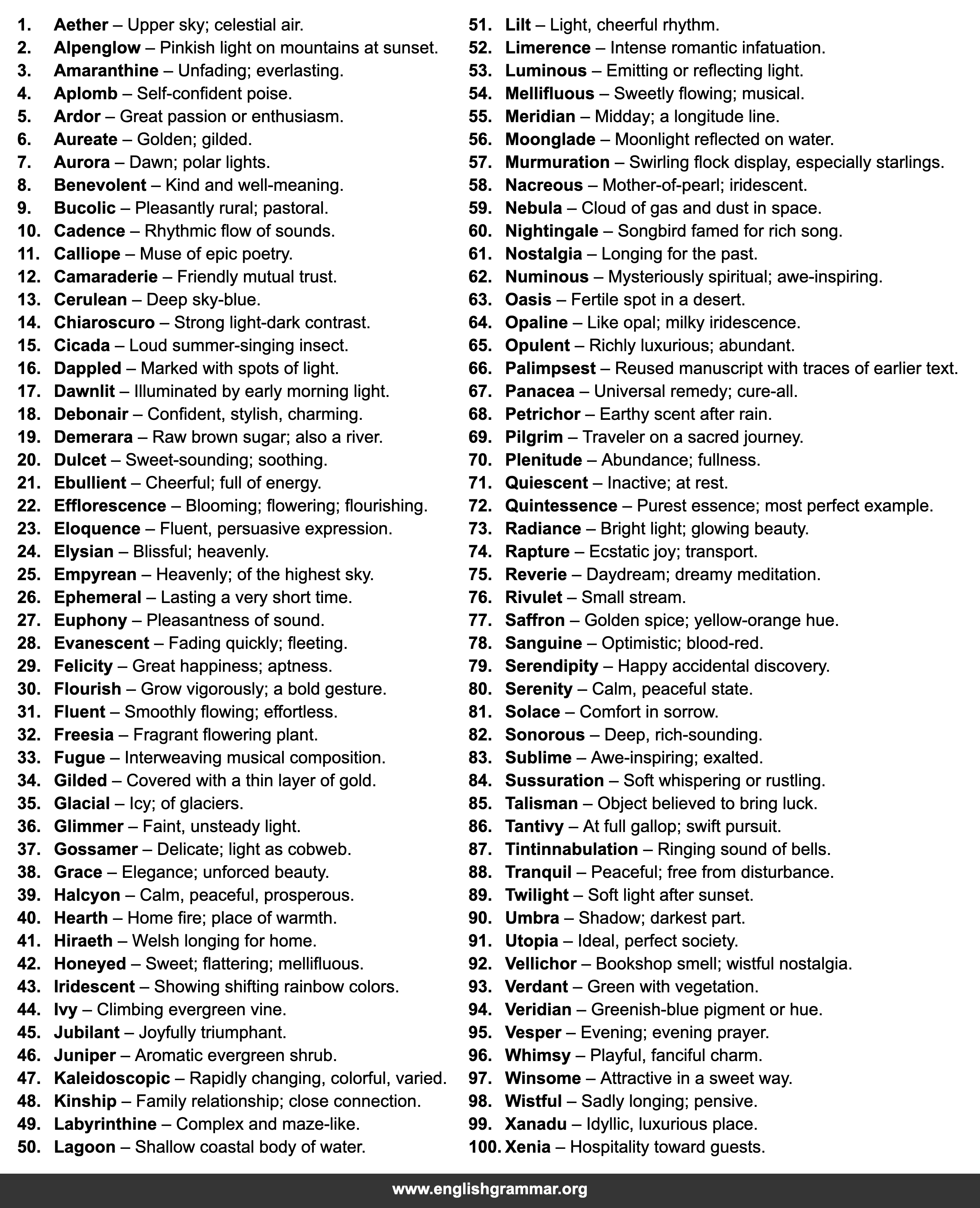 | 20. | Dulcet | Sweet-sounding; soothing. |