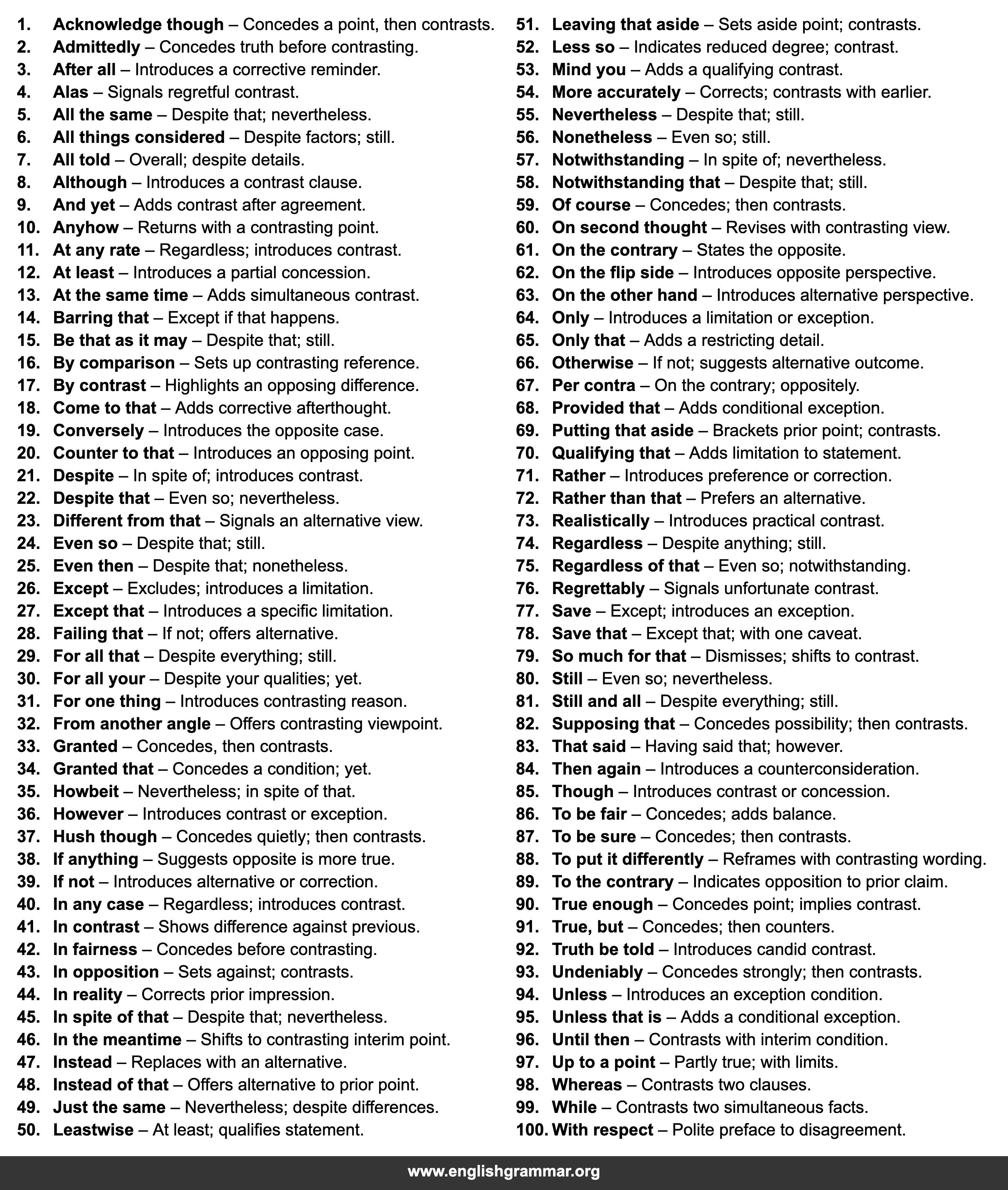 | 93. | Undeniably | Concedes strongly; then contrasts. |