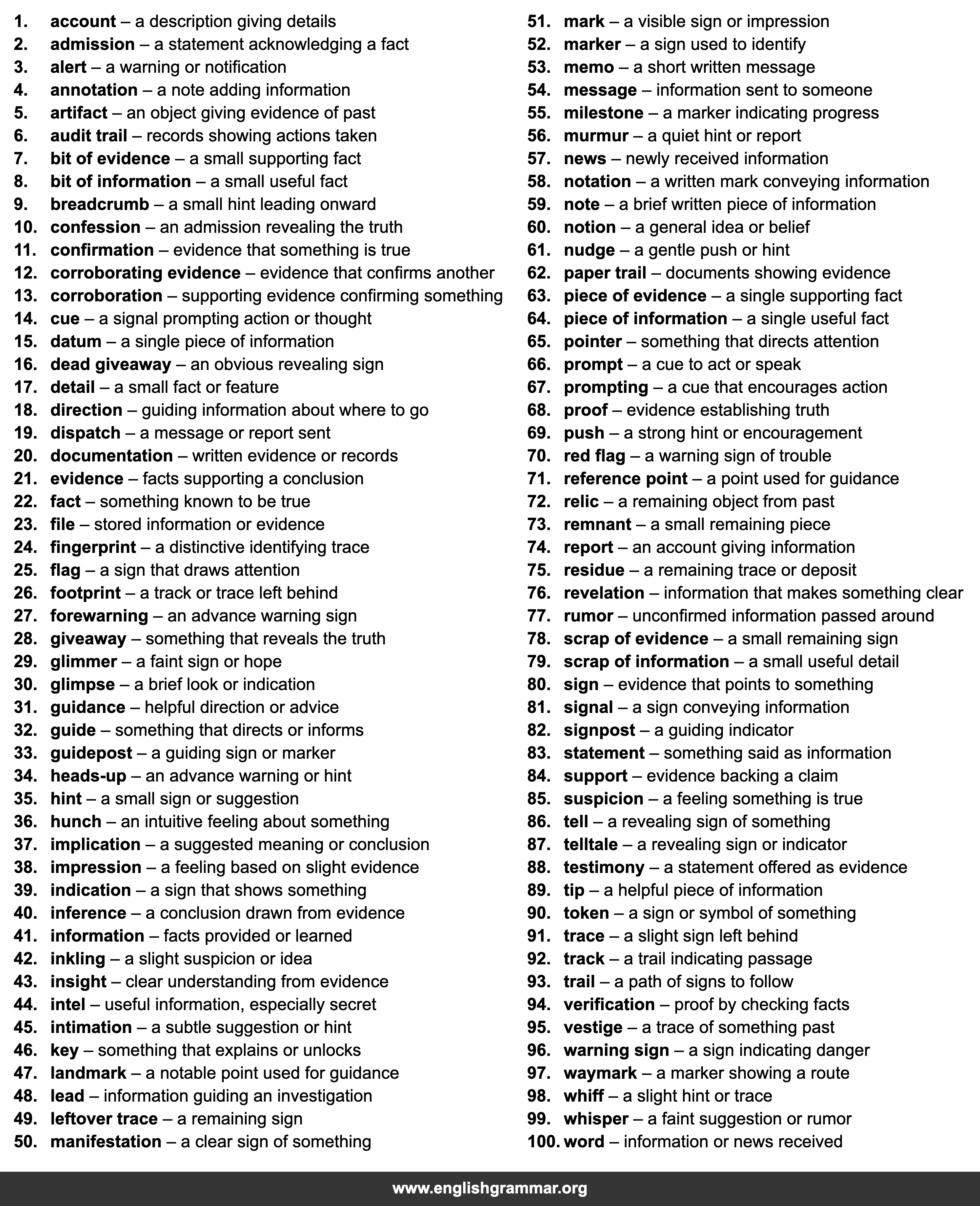 | 63. | piece of evidence | a single supporting fact |