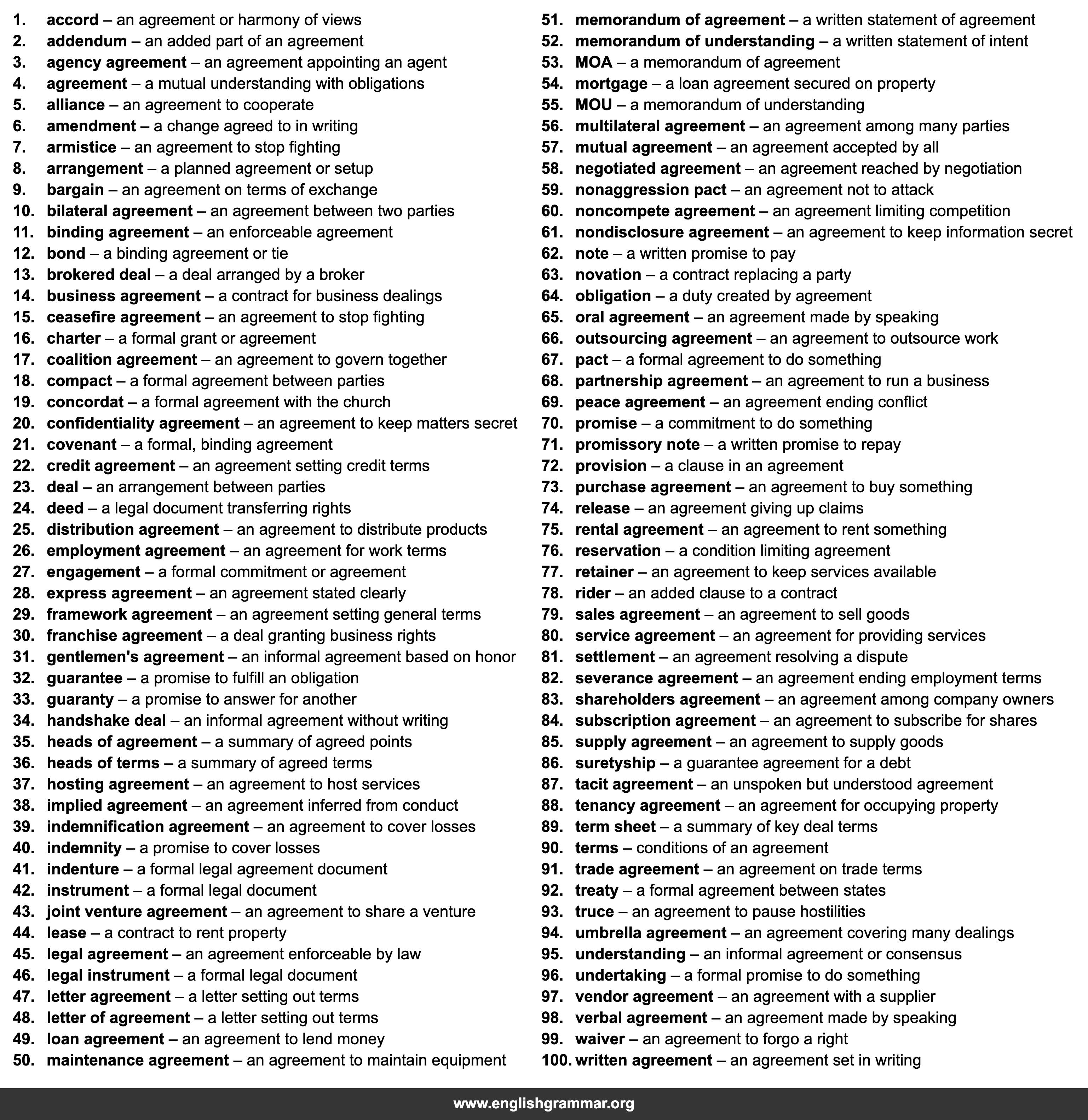 | 68. | partnership agreement | an agreement to run a business |