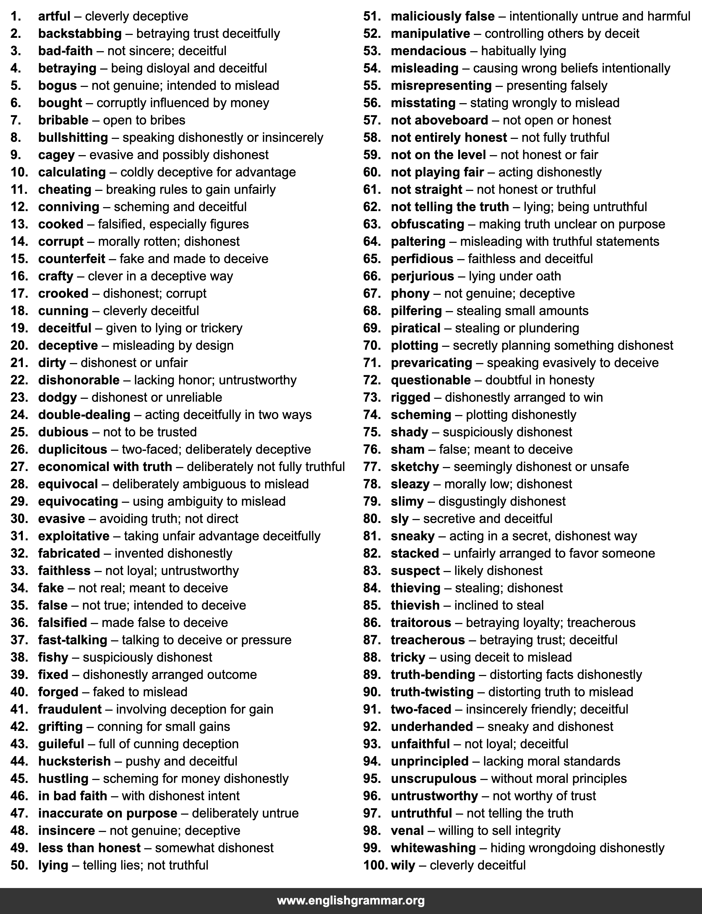 | 26. | duplicitous | two-faced; deliberately deceptive |