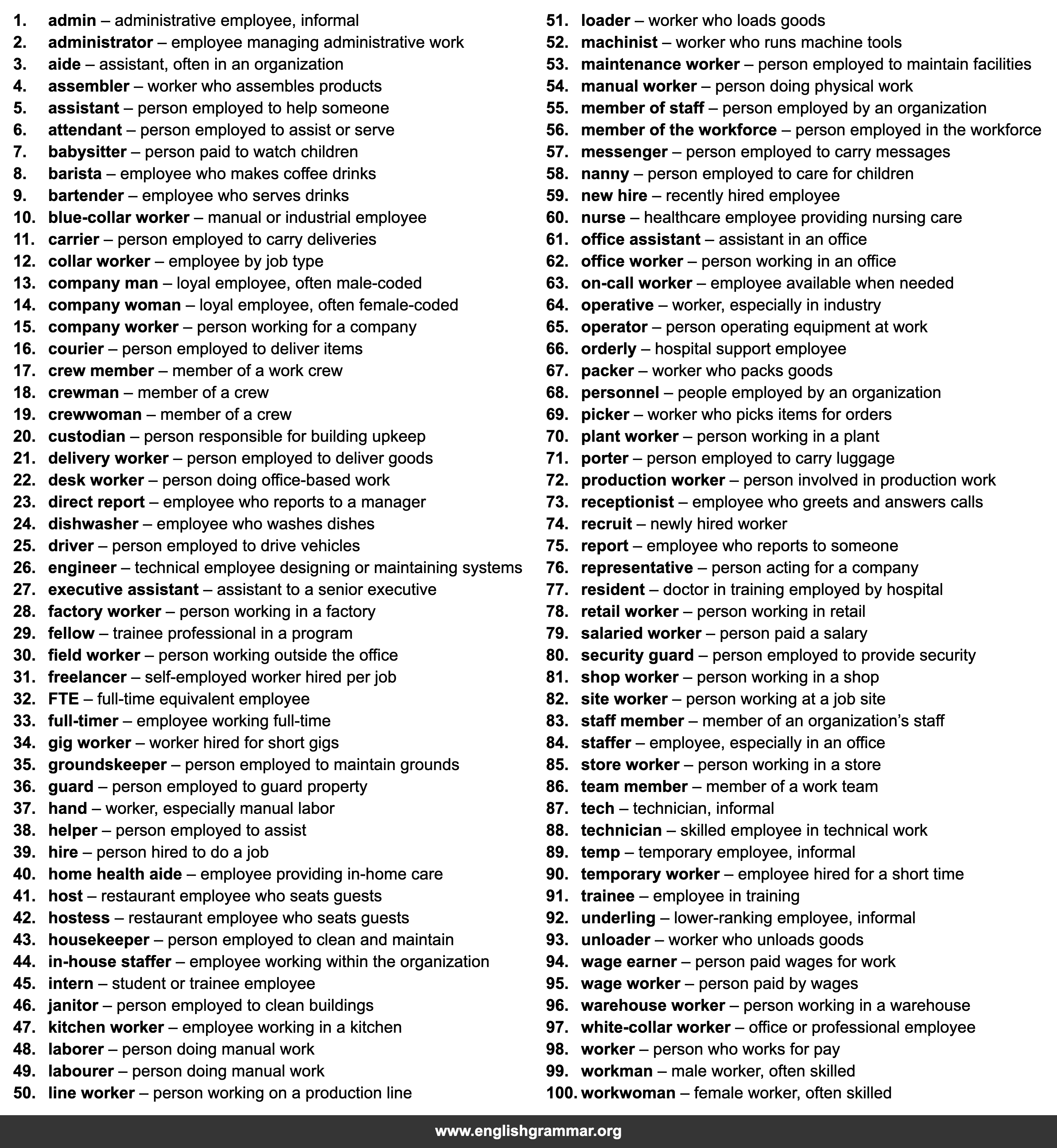 | 48. | laborer | person doing manual work |