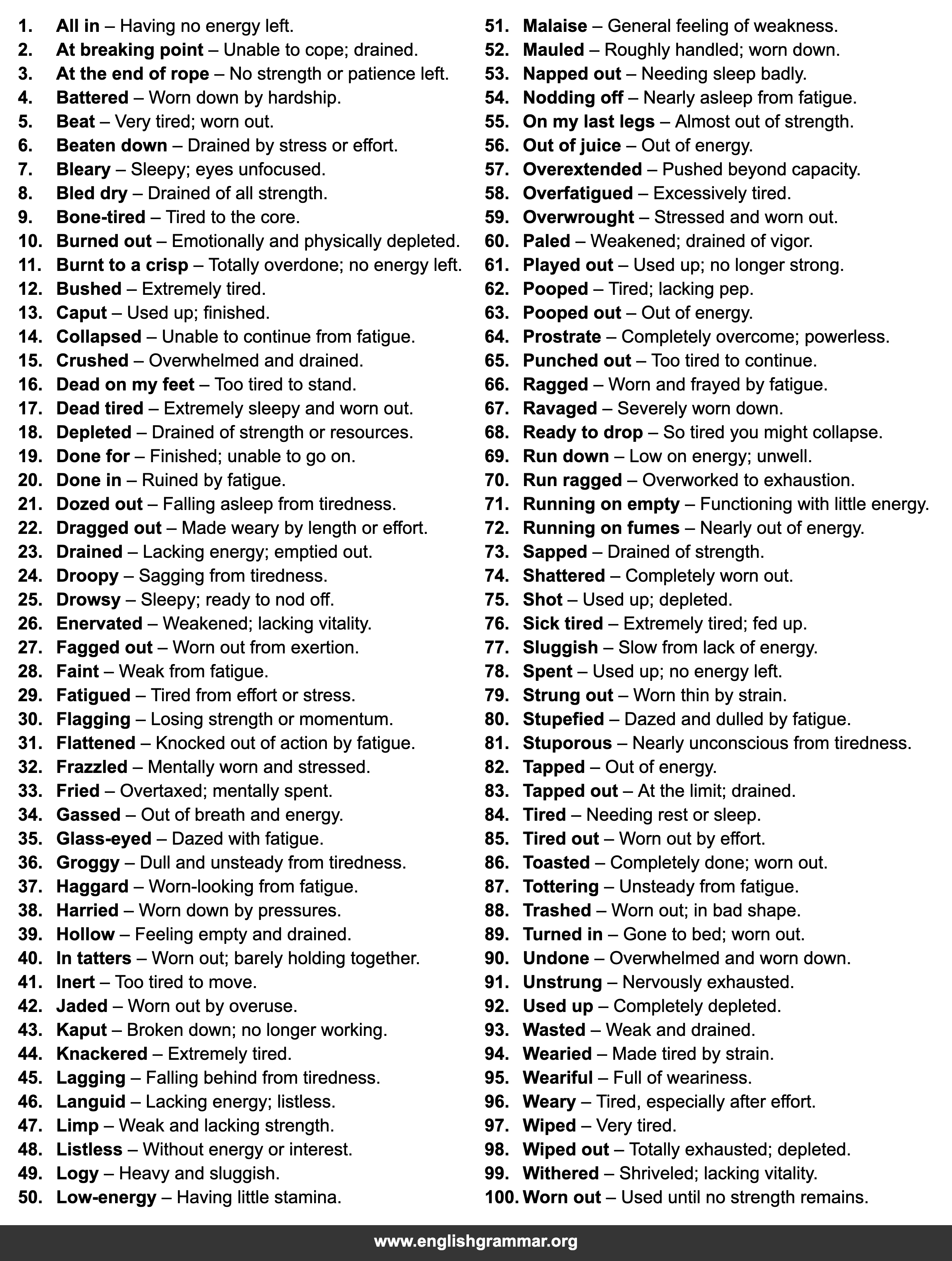 | 10. | Burned out | Emotionally and physically depleted. |