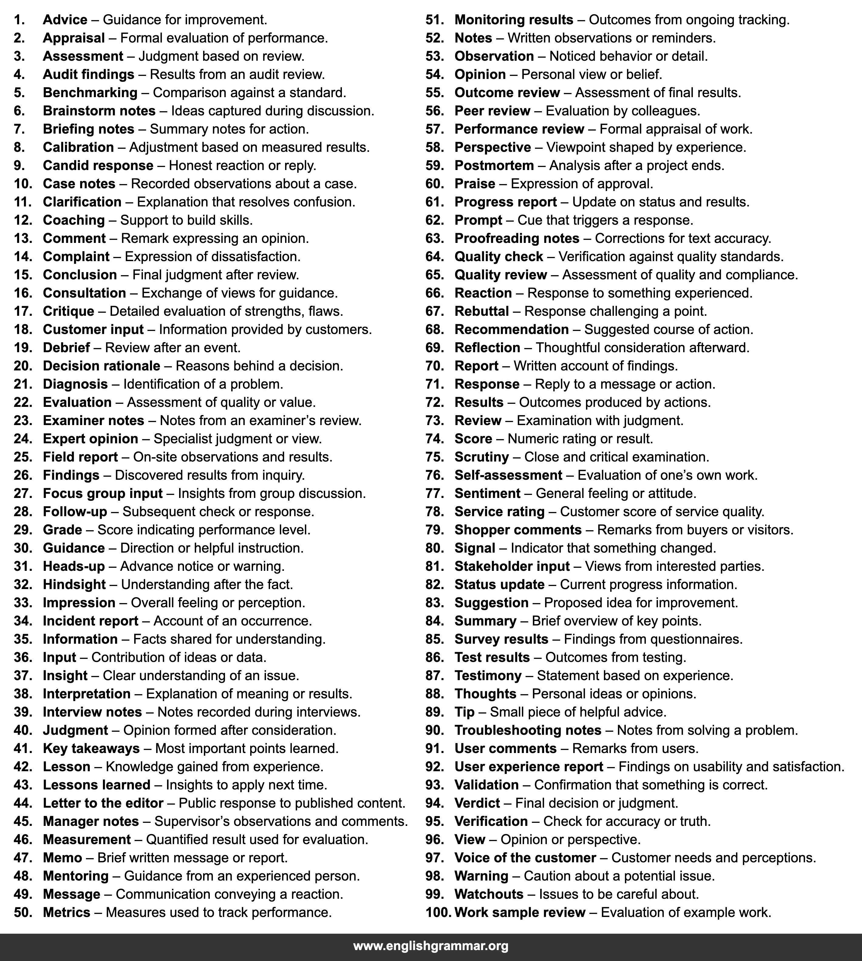| 57. | Performance review | Formal appraisal of work. |
