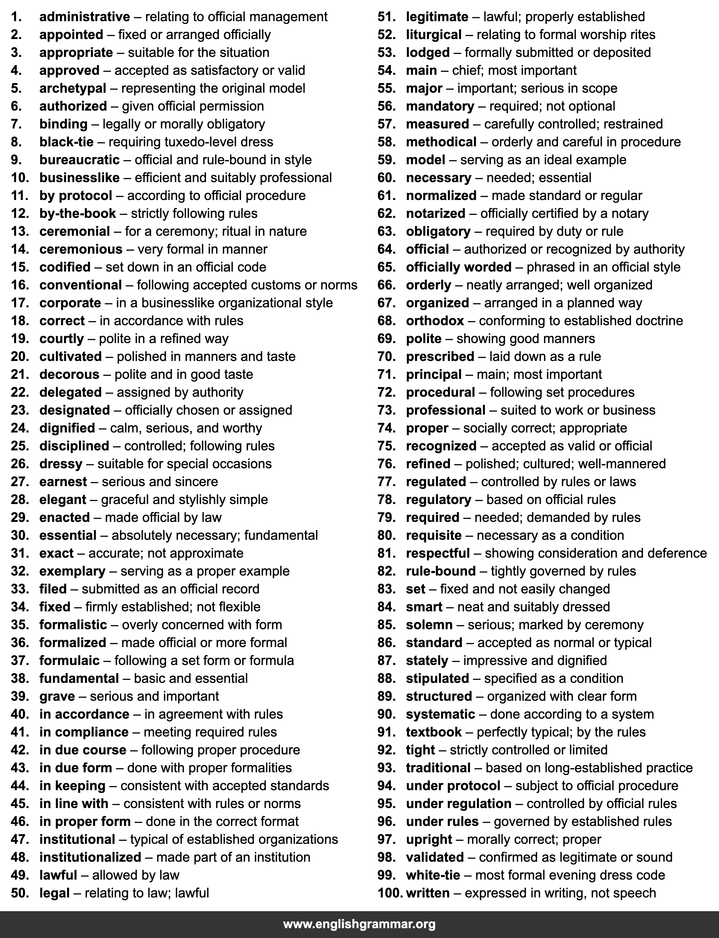 | 14. | ceremonious | very formal in manner |