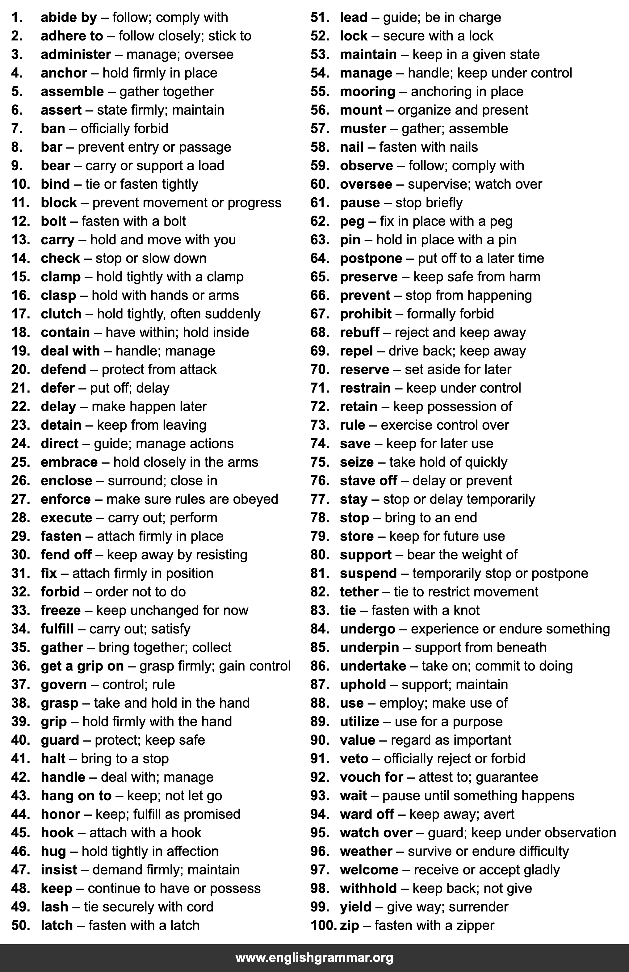 | 43. | hang on to | keep; not let go |