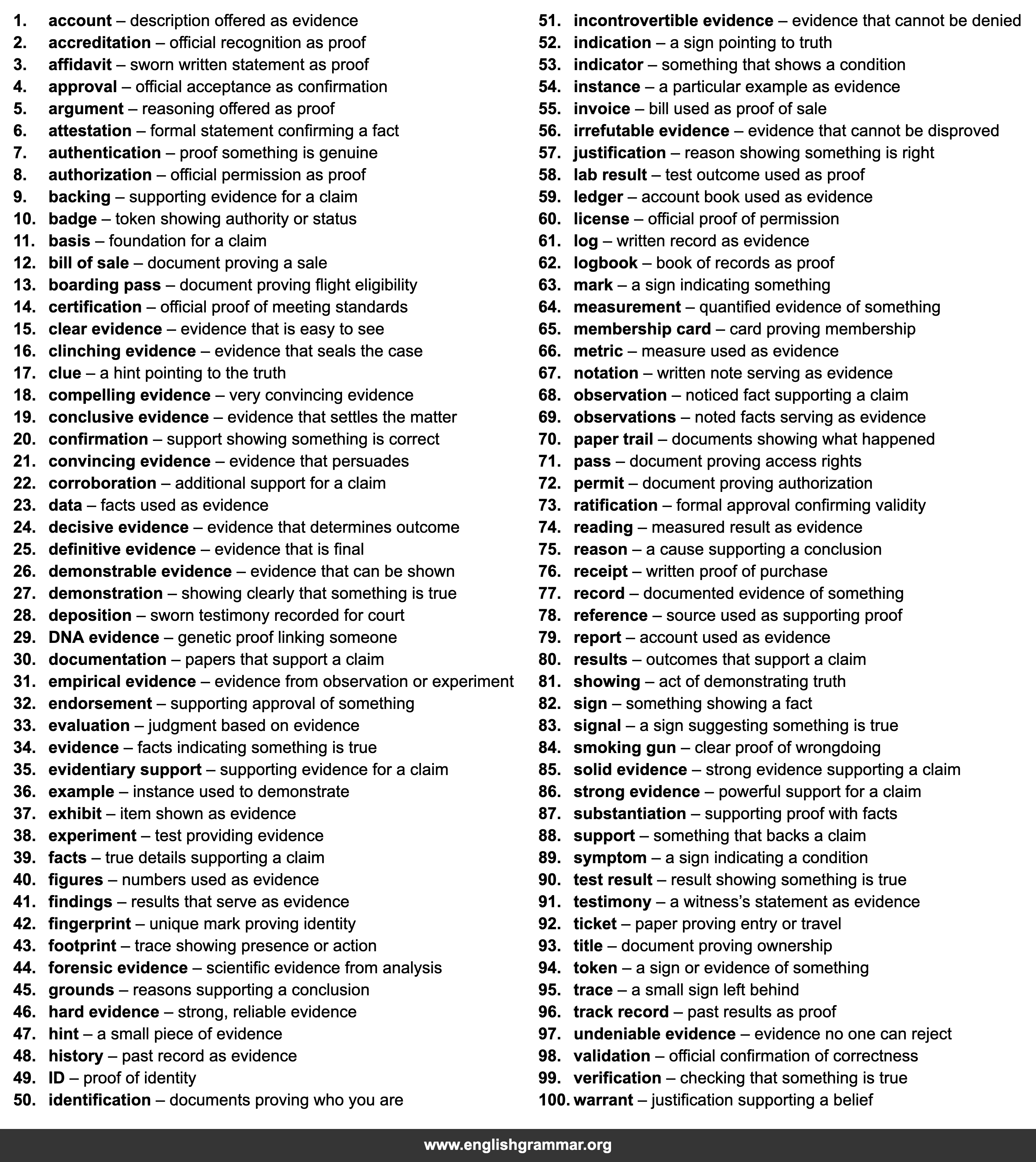| 56. | irrefutable evidence | evidence that cannot be disproved |