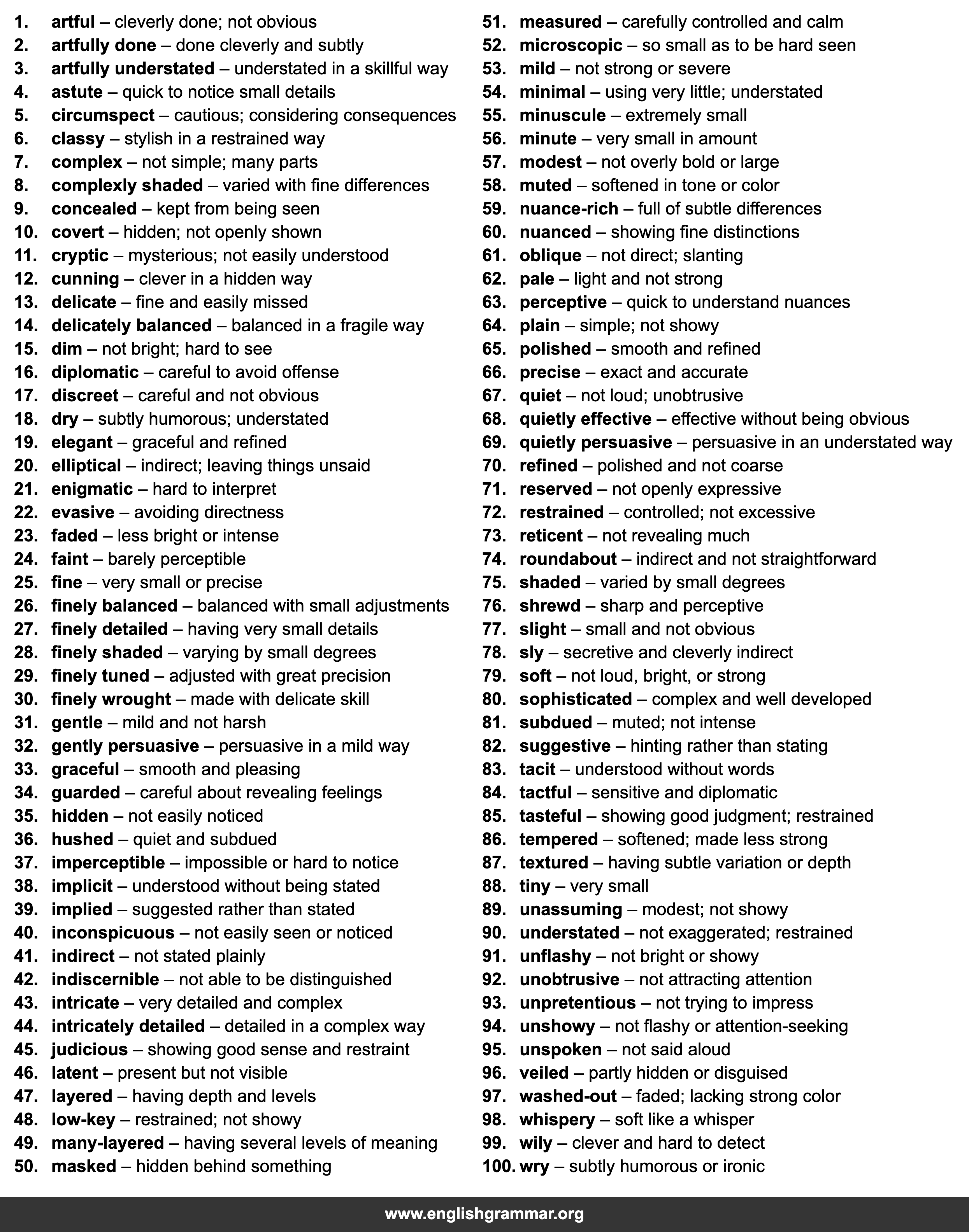 | 94. | unshowy | not flashy or attention-seeking |