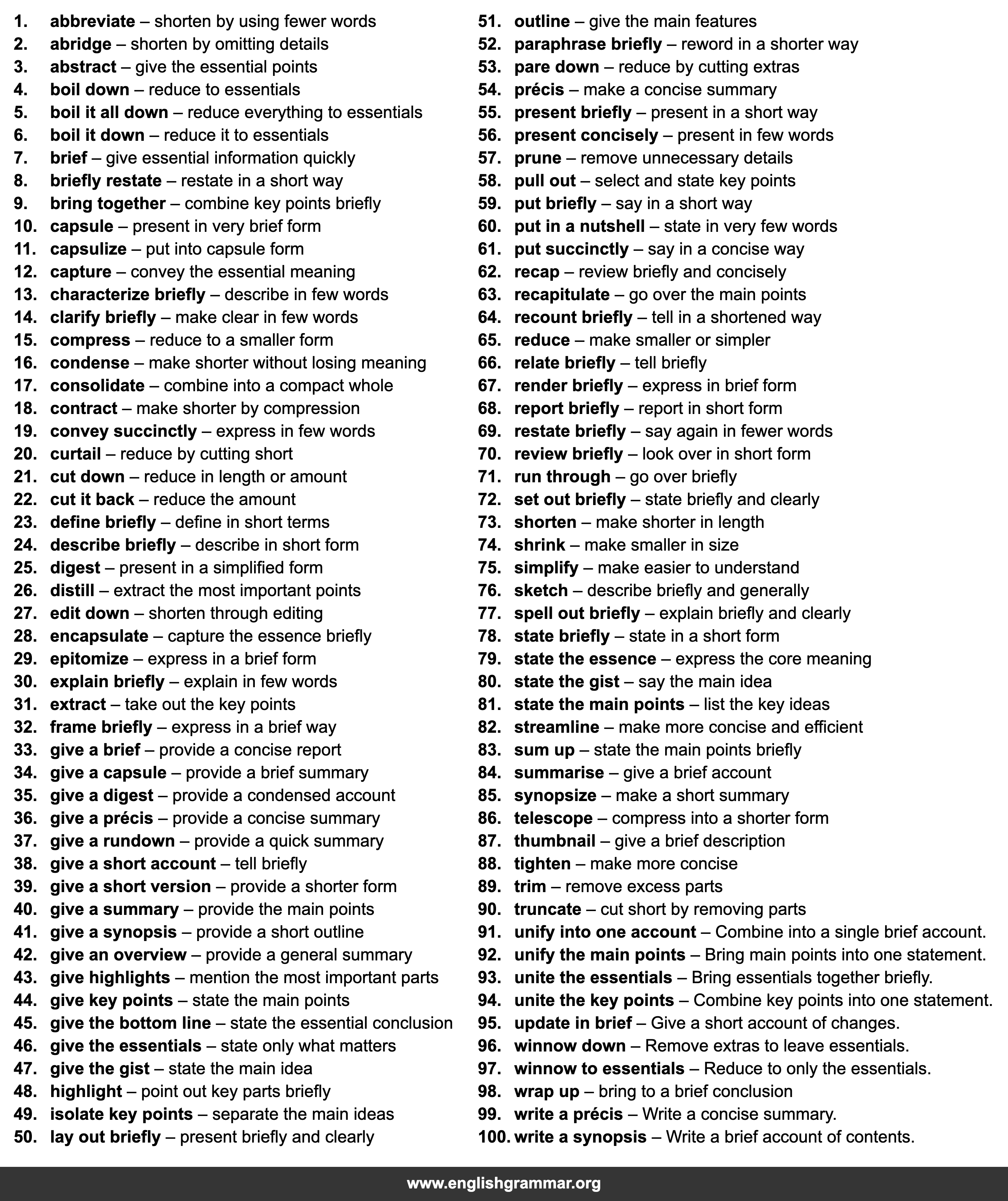 | 97. | winnow to essentials | Reduce to only the essentials. |