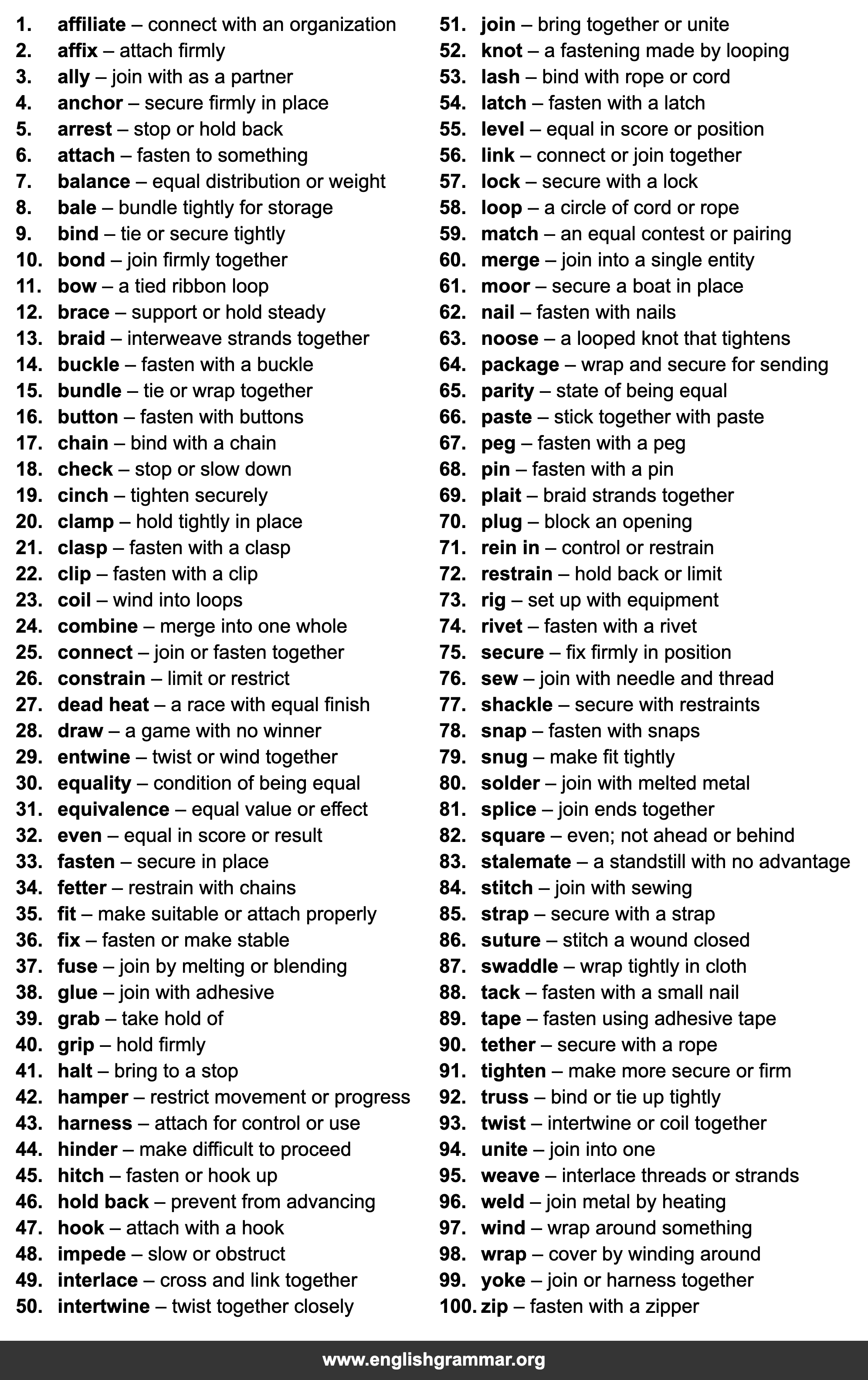 | 33. | fasten | secure in place |