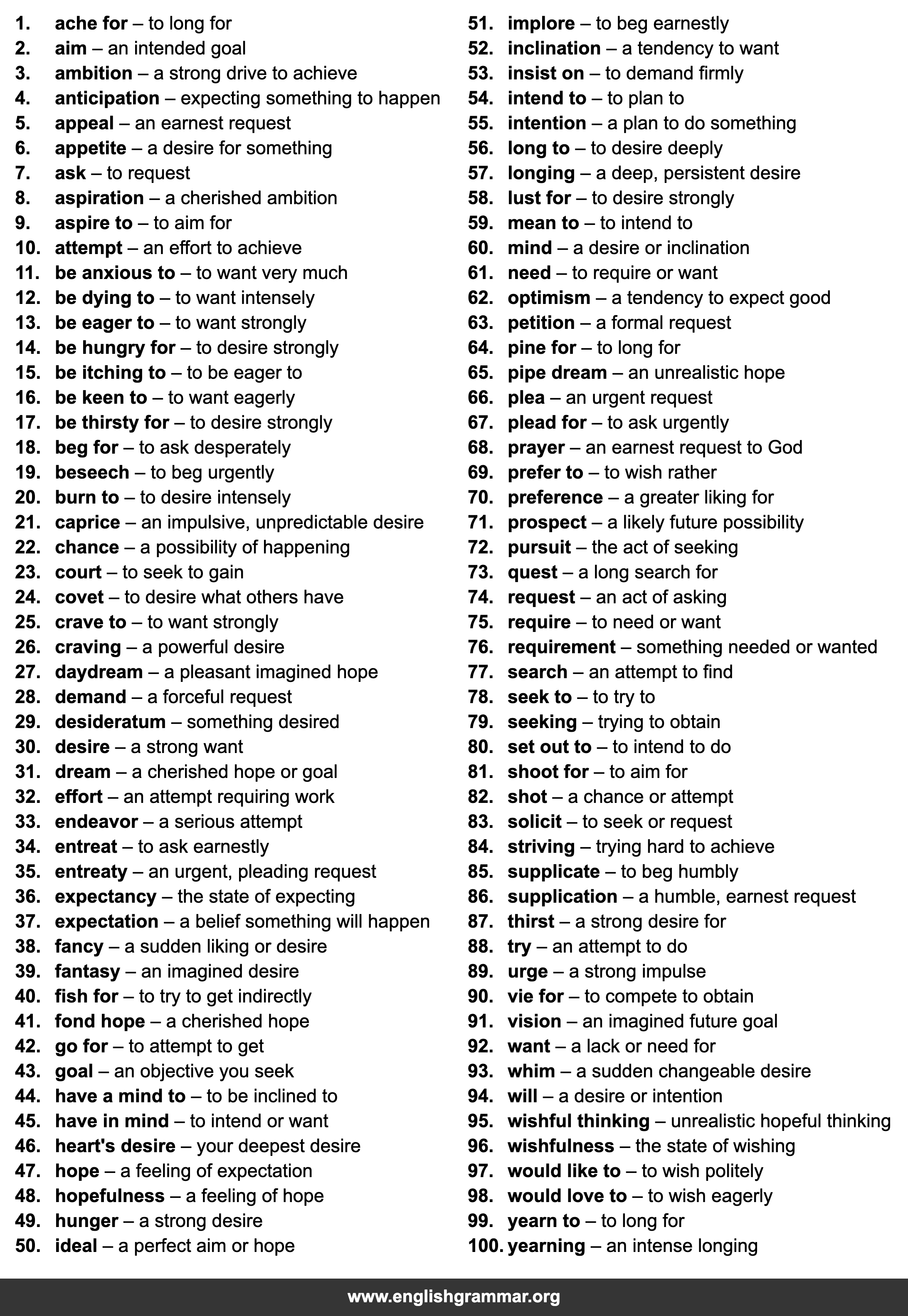 | 30. | desire | a strong want |