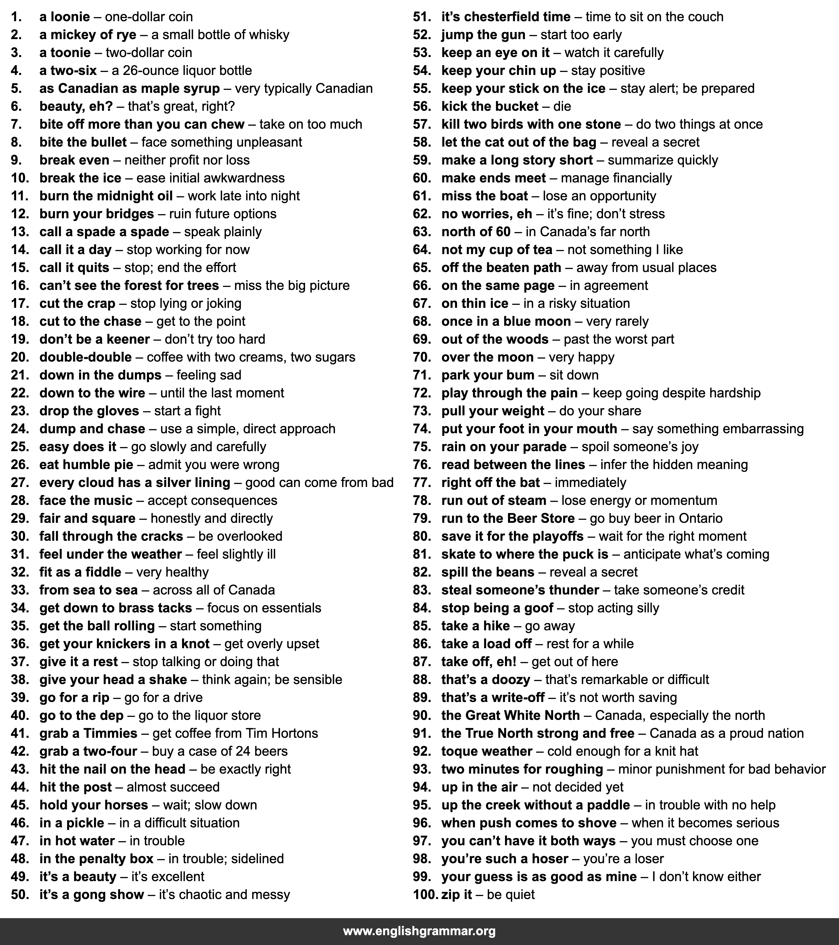 | 62. | no worries, eh | it’s fine; don’t stress |