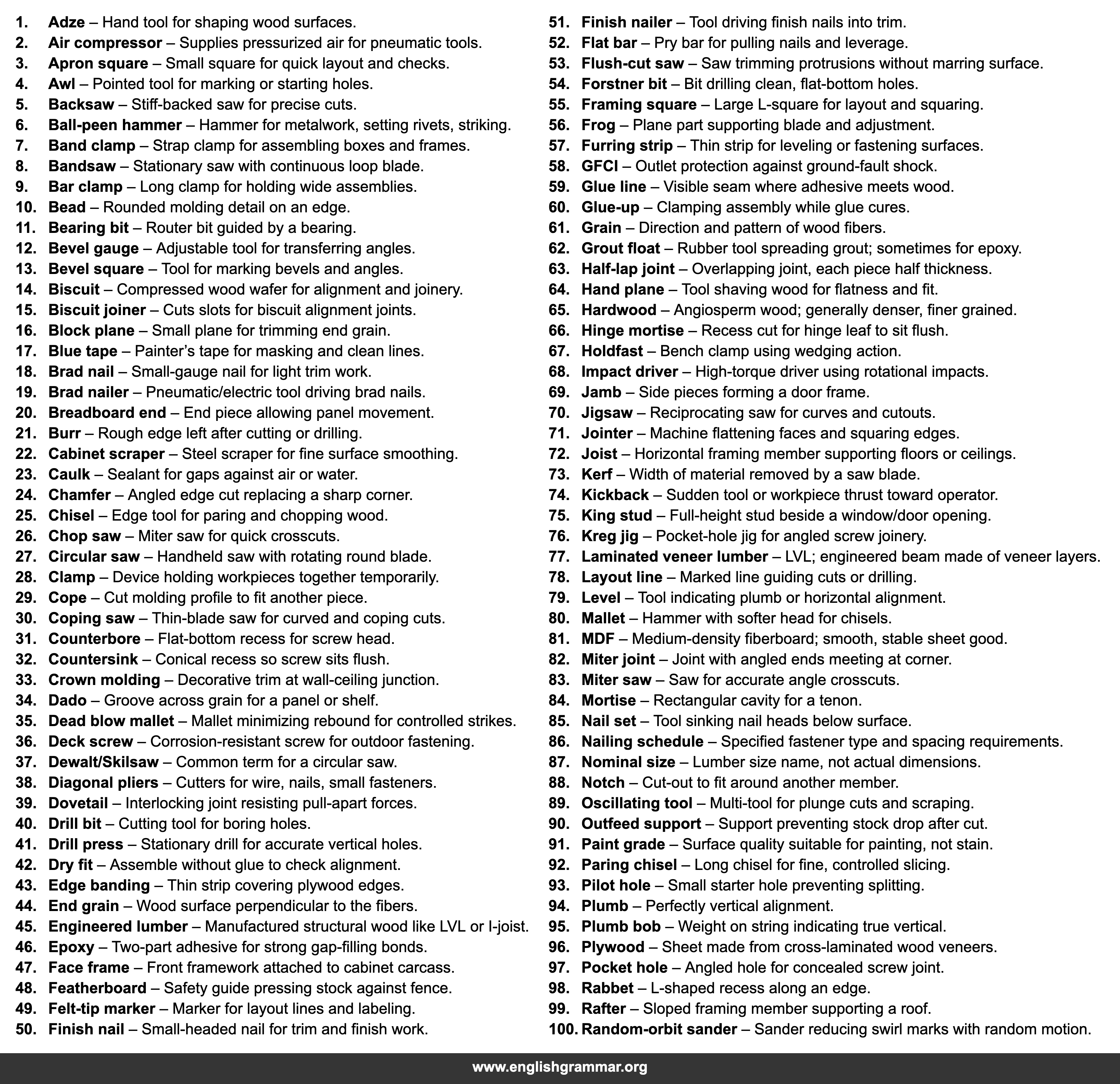 | 85. | Nail set | Tool sinking nail heads below surface. |