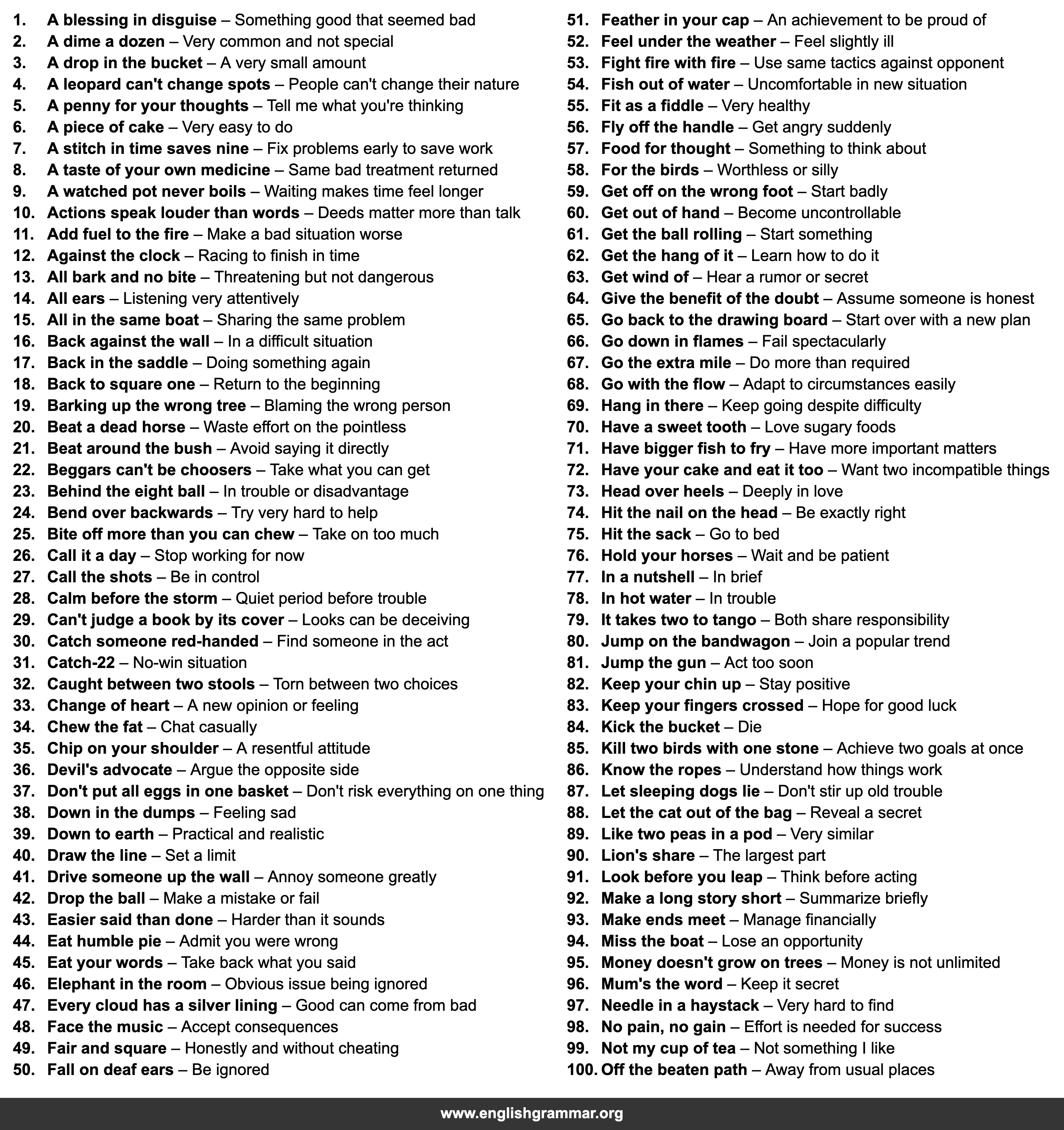 | 69. | Hang in there | Keep going despite difficulty |