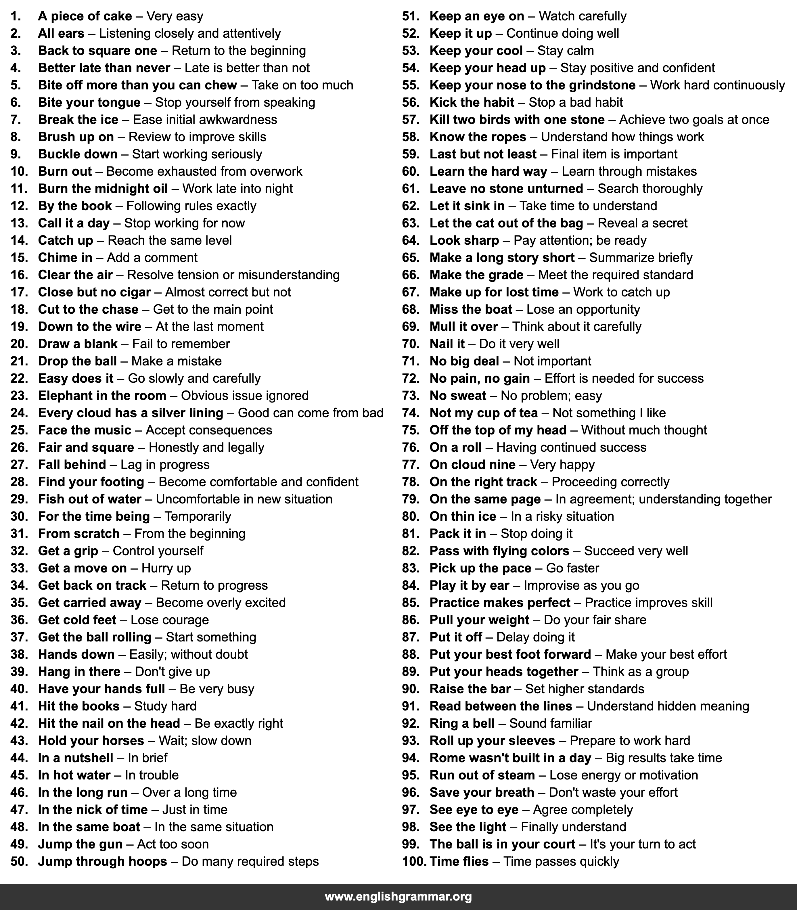 | 39. | Hang in there | Don’t give up |