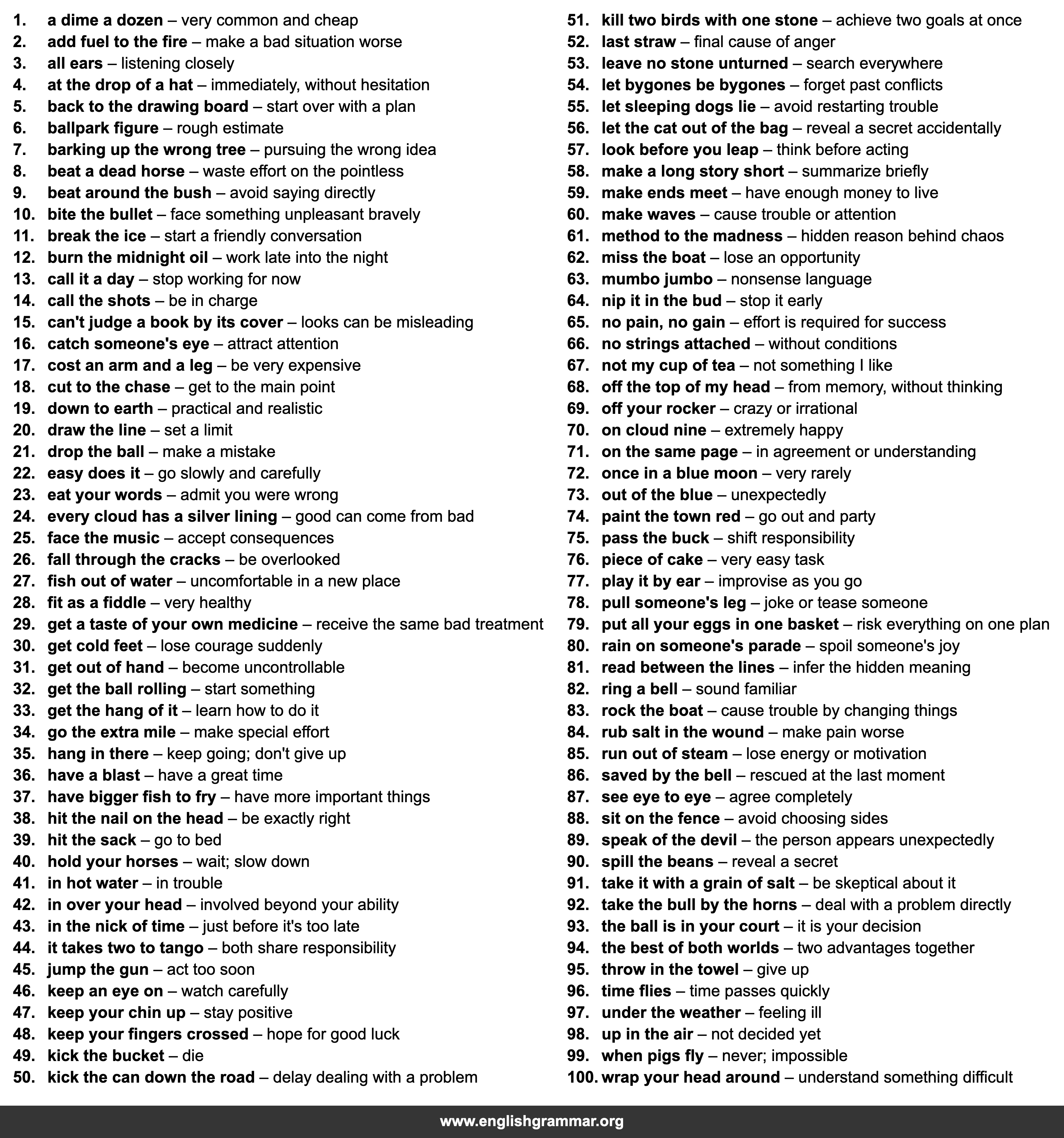 | 56. | let the cat out of the bag | reveal a secret accidentally |
