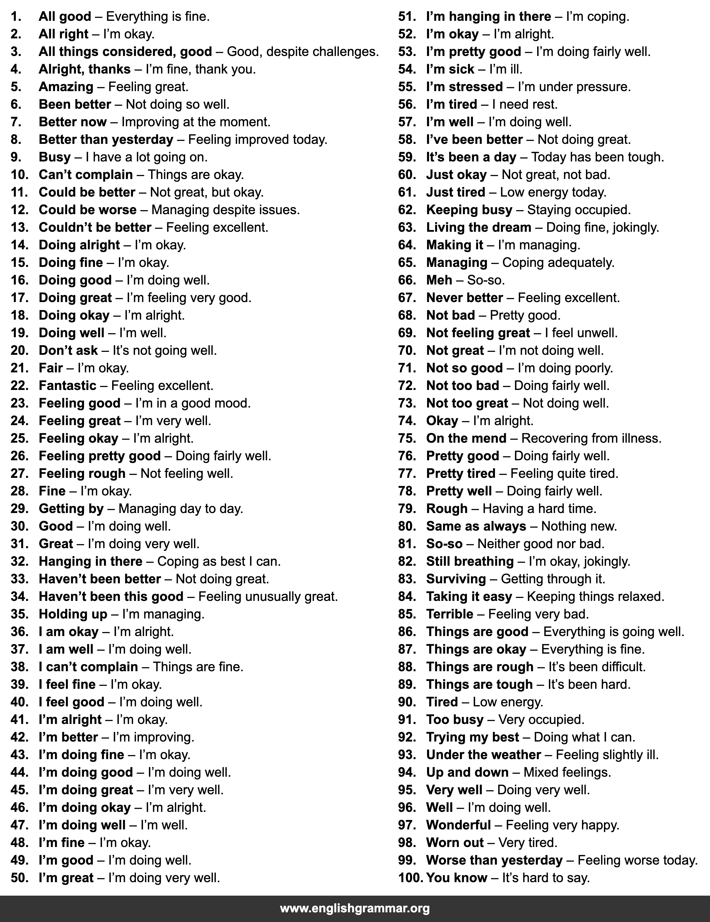 | 50. | I’m great | I’m doing very well. |