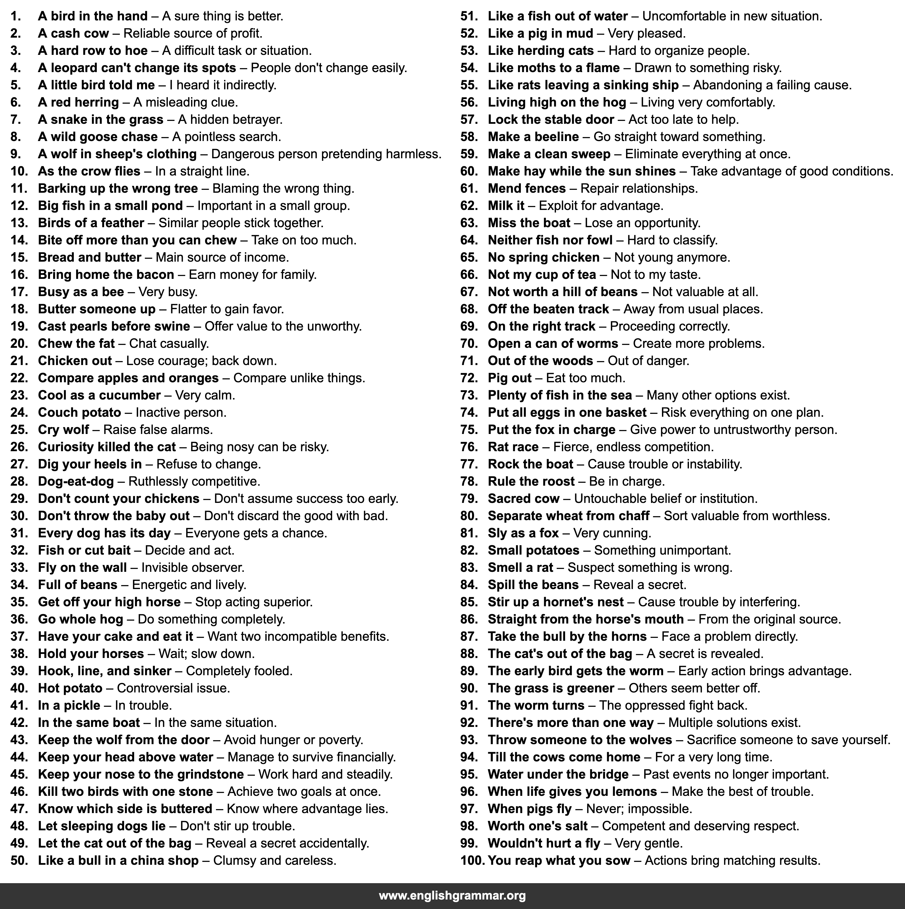 | 4. | A leopard can’t change its spots | People don’t change easily. |