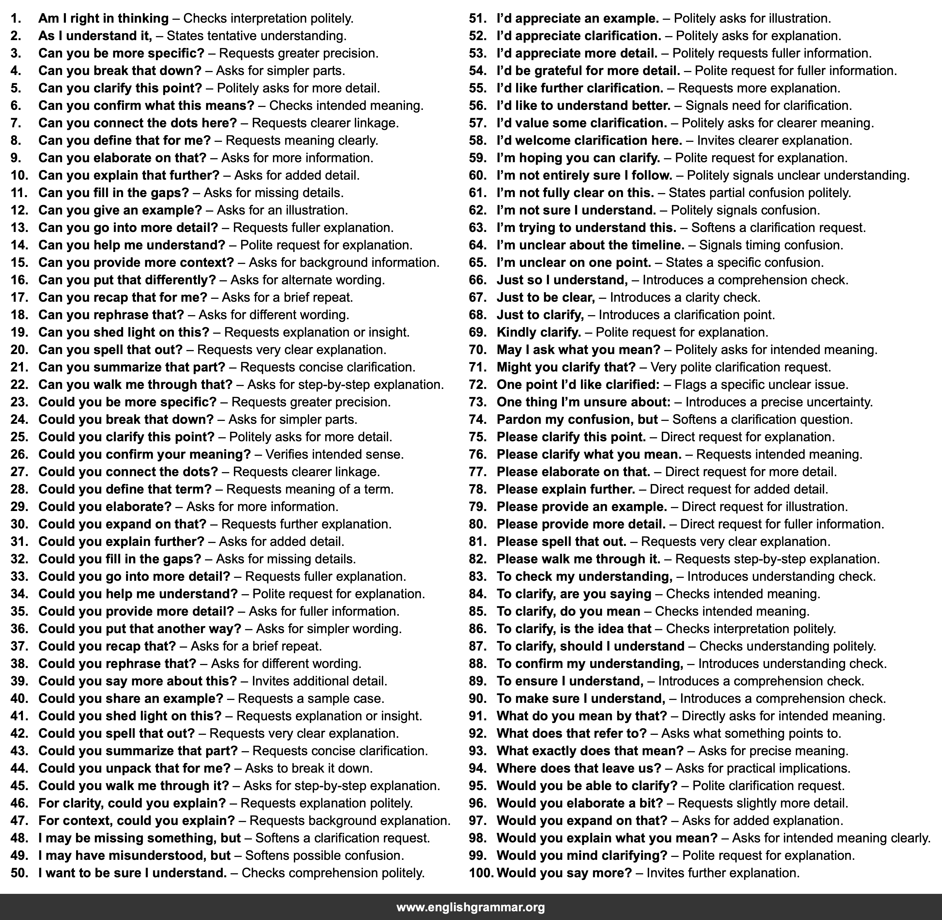 | 46. | For clarity, could you explain? | Requests explanation politely. |
