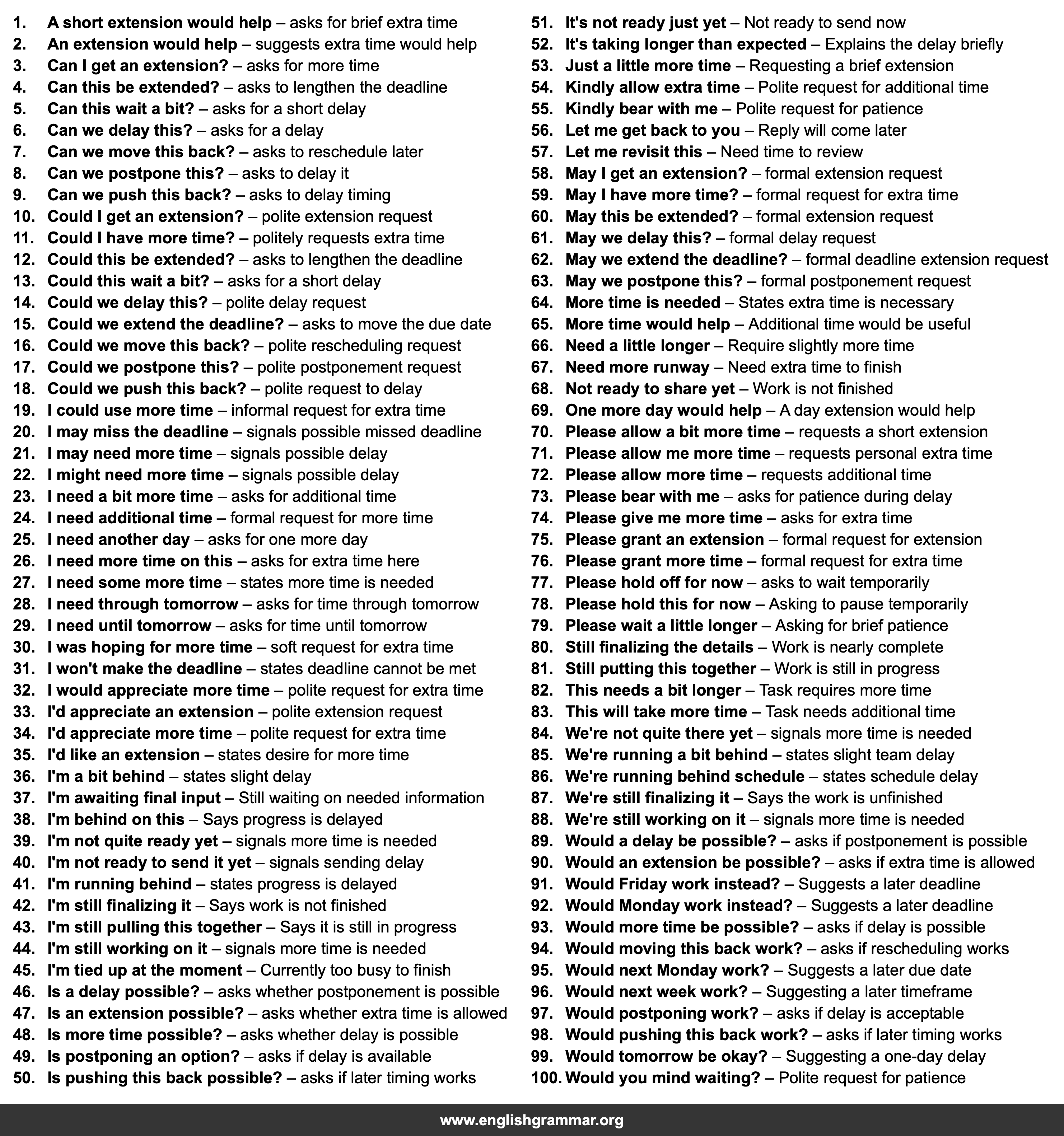 | 34. | I’d appreciate more time | polite request for extra time |