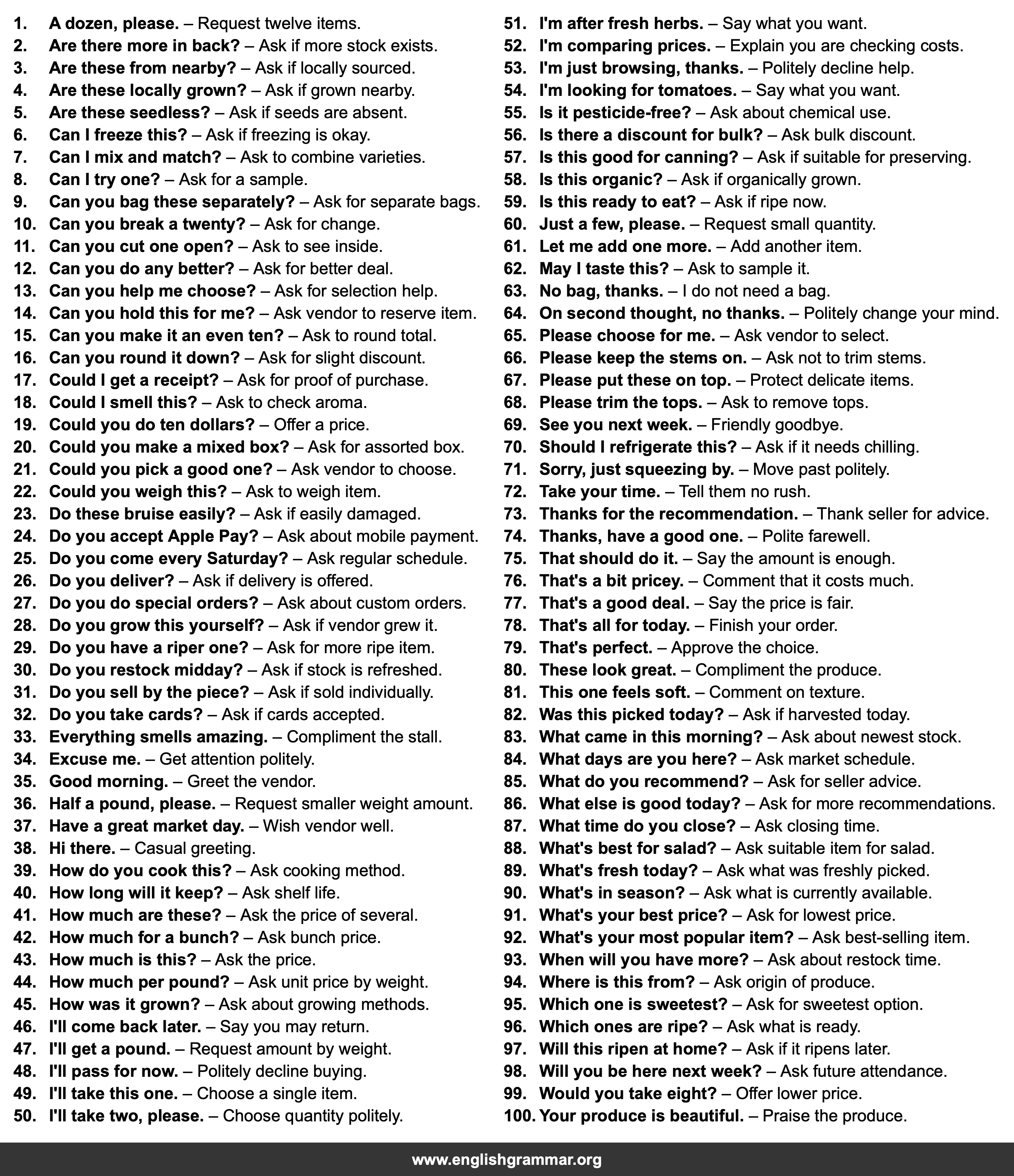 | 94. | Where is this from? | Ask origin of produce. |