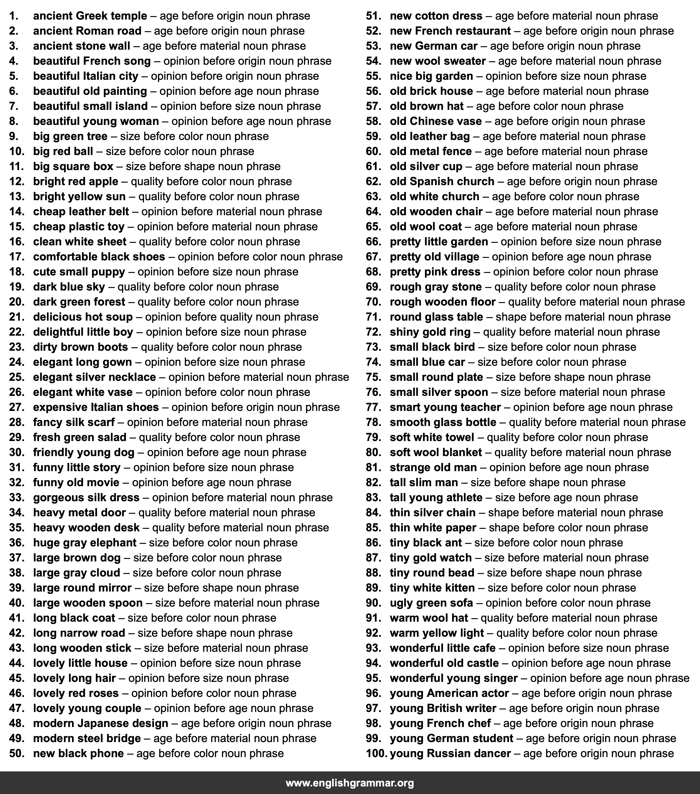 | 94. | wonderful old castle | opinion before age noun phrase |