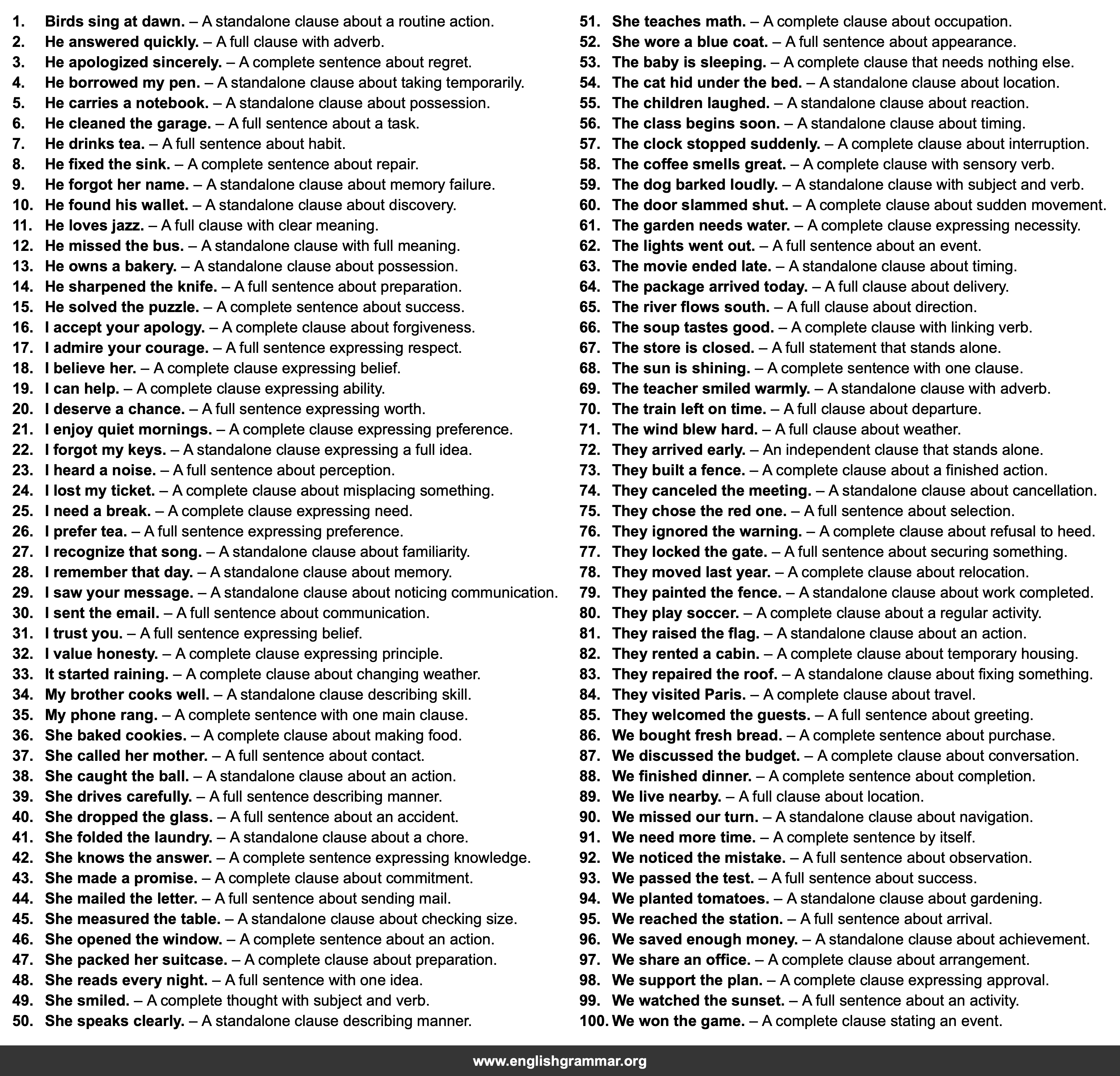 | 1. | Birds sing at dawn. | A standalone clause about a routine action. |