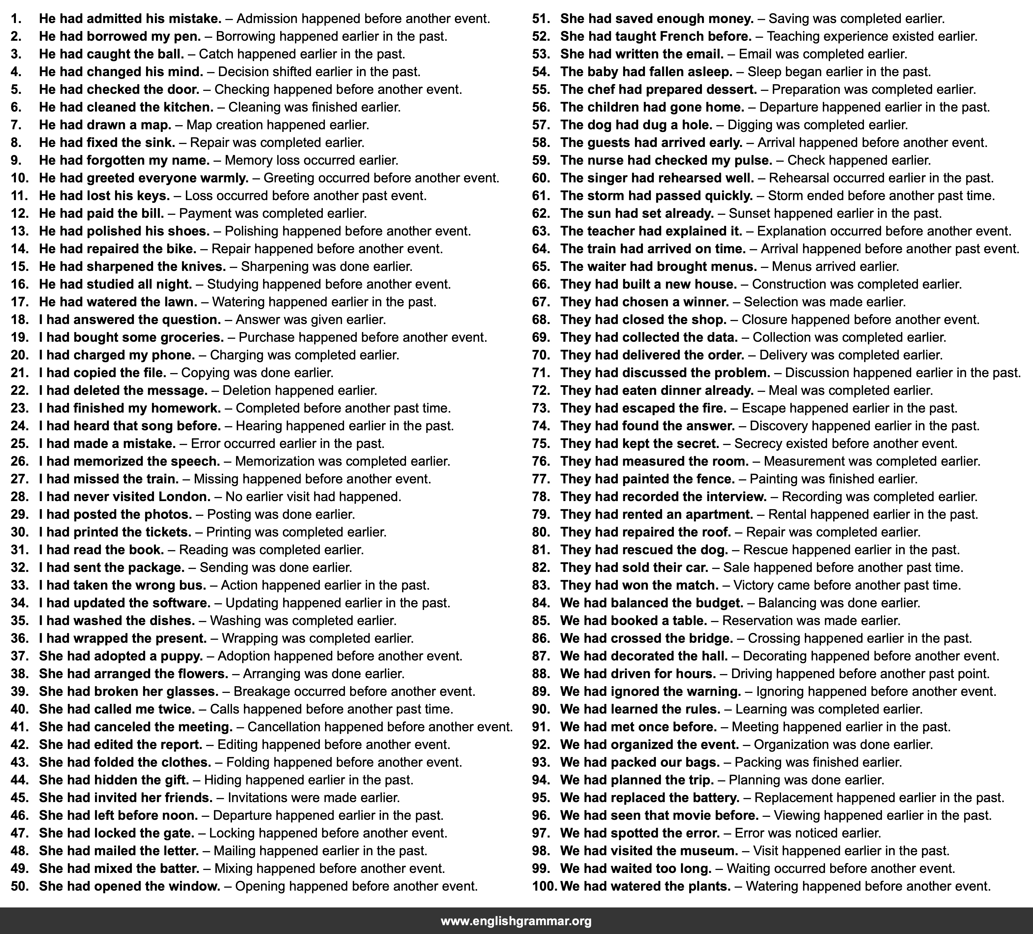 | 63. | The teacher had explained it. | Explanation occurred before another event. |