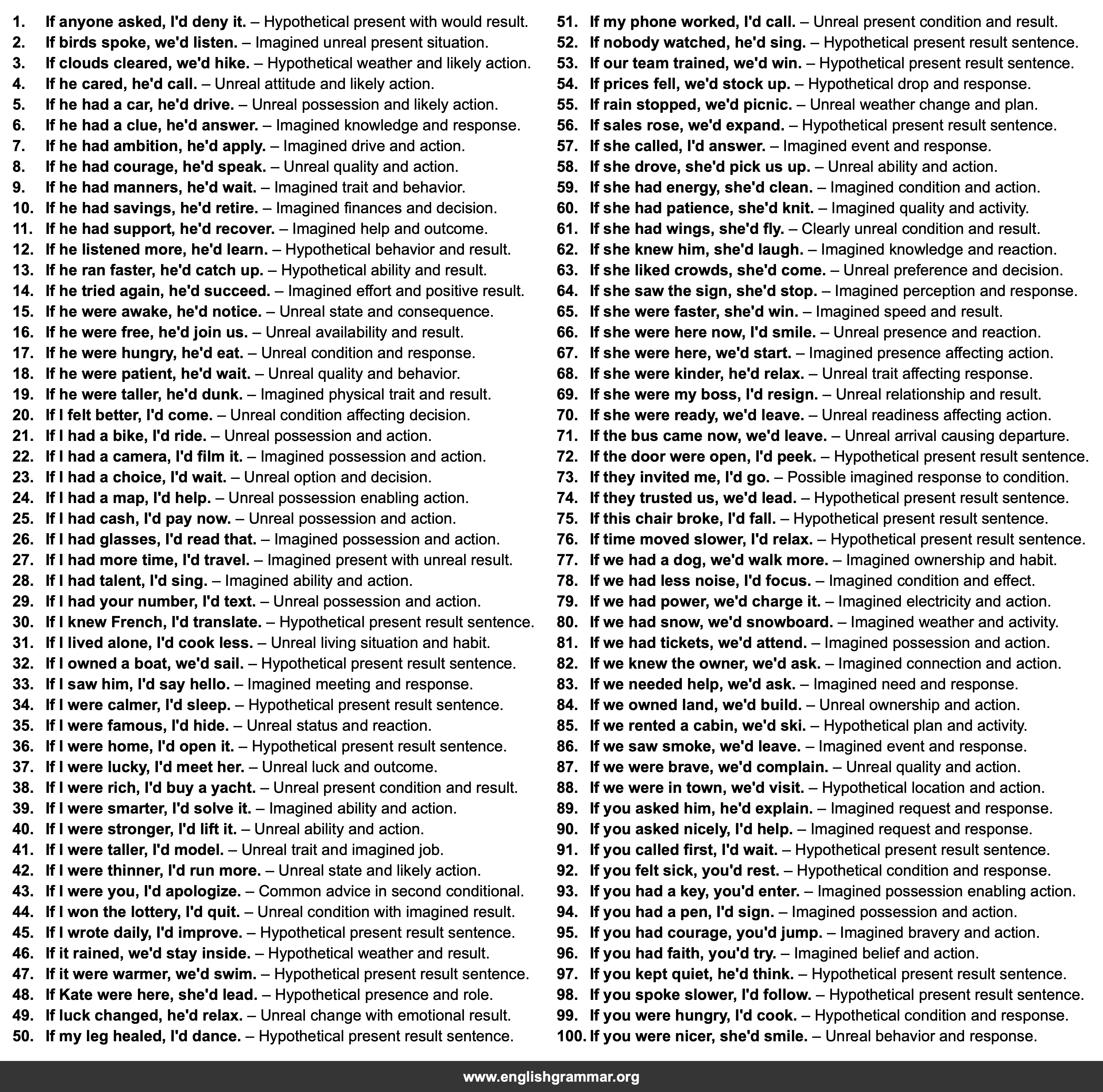 | 98. | If you spoke slower, I’d follow. | Hypothetical present result sentence. |