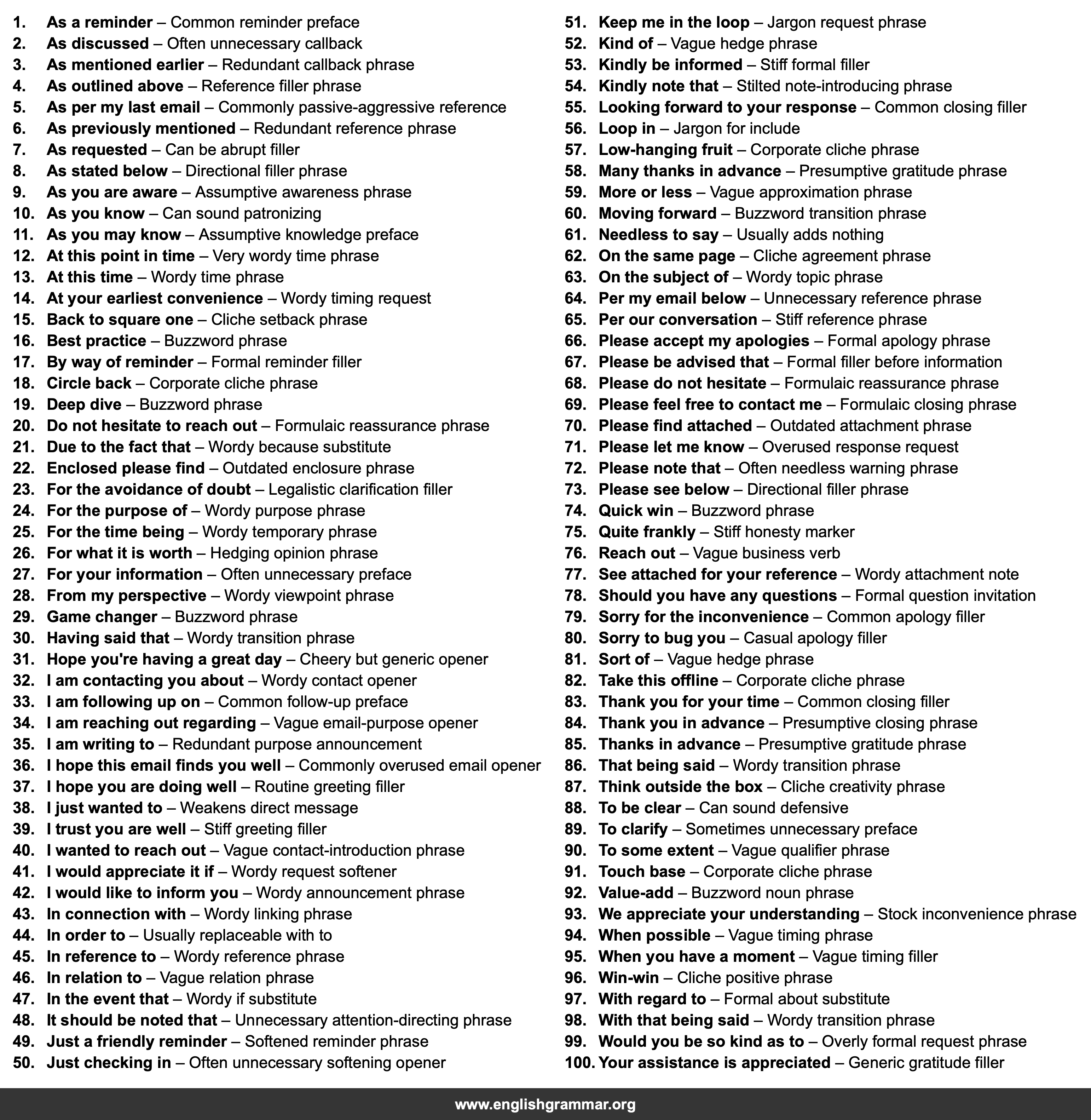 | 27. | For your information | Often unnecessary preface |