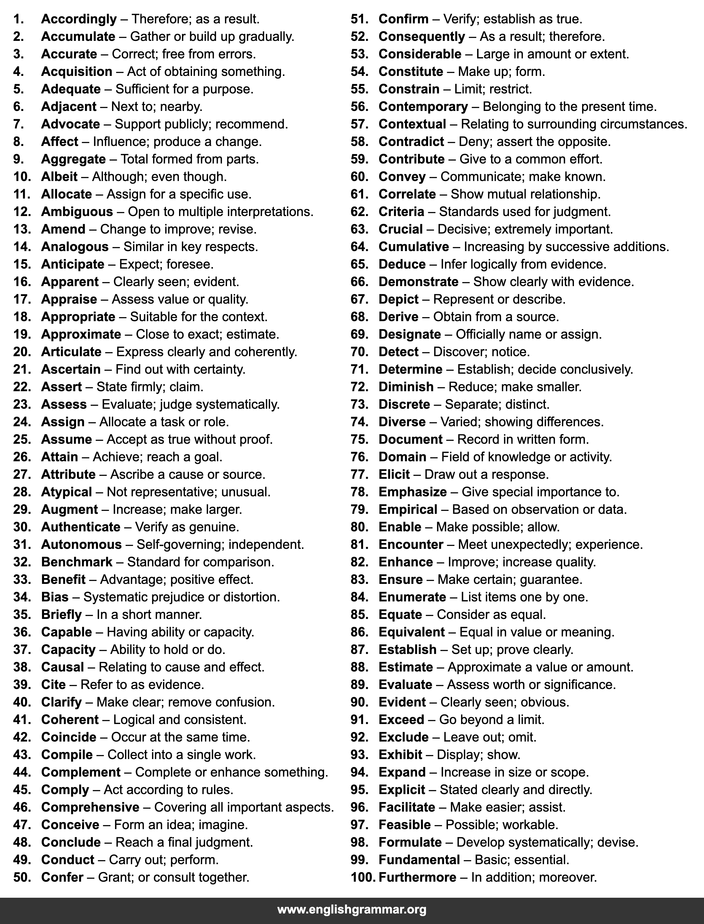 | 100. | Furthermore | In addition; moreover. |