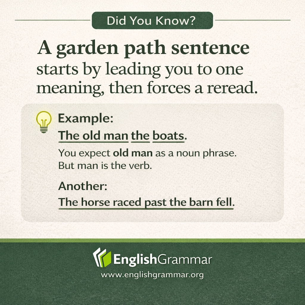 Another famous example is The horse raced past the barn fell. Many readers first treat raced as the main verb. Then fell appears, and the sentence has to be reanalyzed. The fuller meaning is closer to The horse that was raced past the barn fell.
