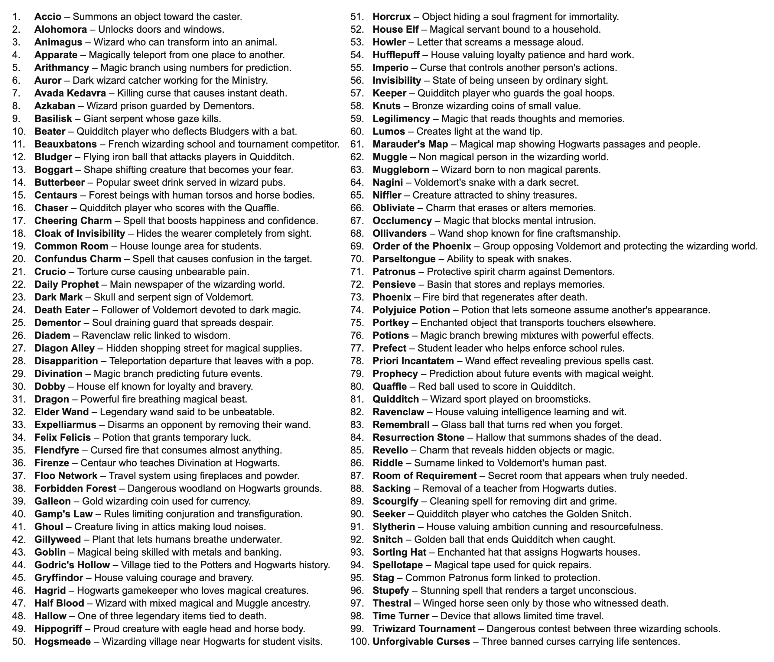 | 100. | Unforgivable Curses | Three banned curses carrying life sentences. |