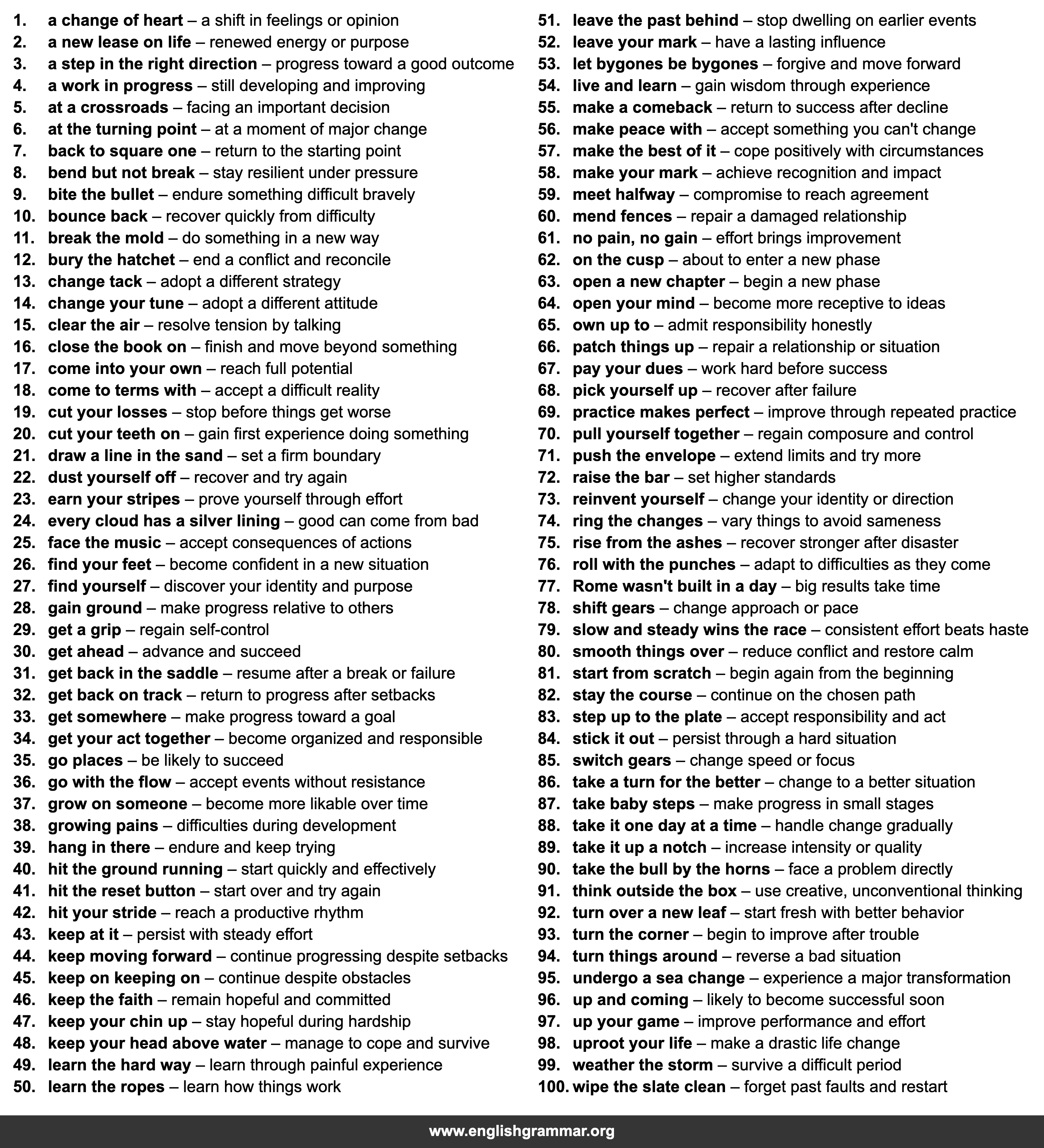 | 45. | keep on keeping on | continue despite obstacles |