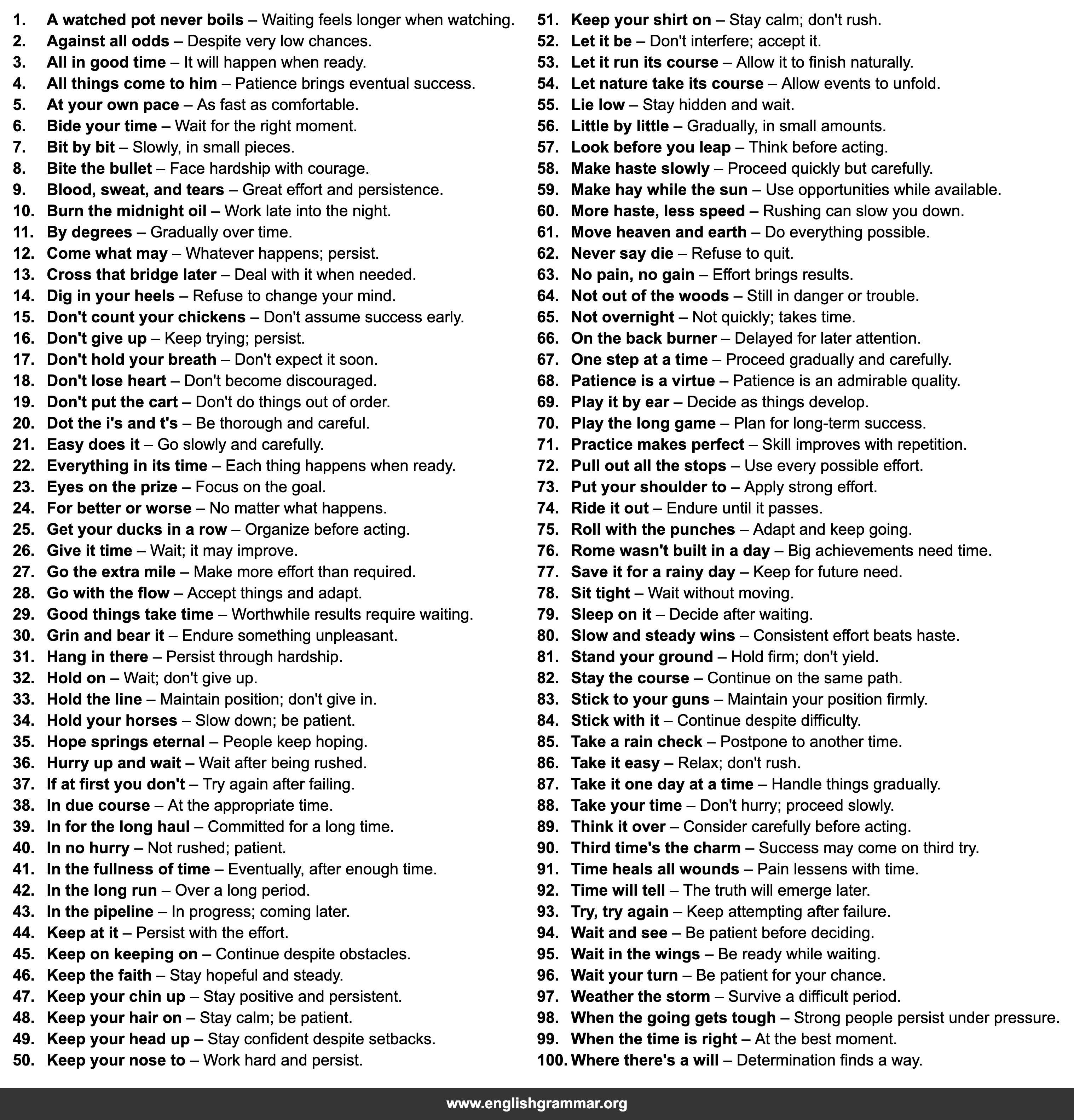 | 88. | Take your time | Don’t hurry; proceed slowly. |