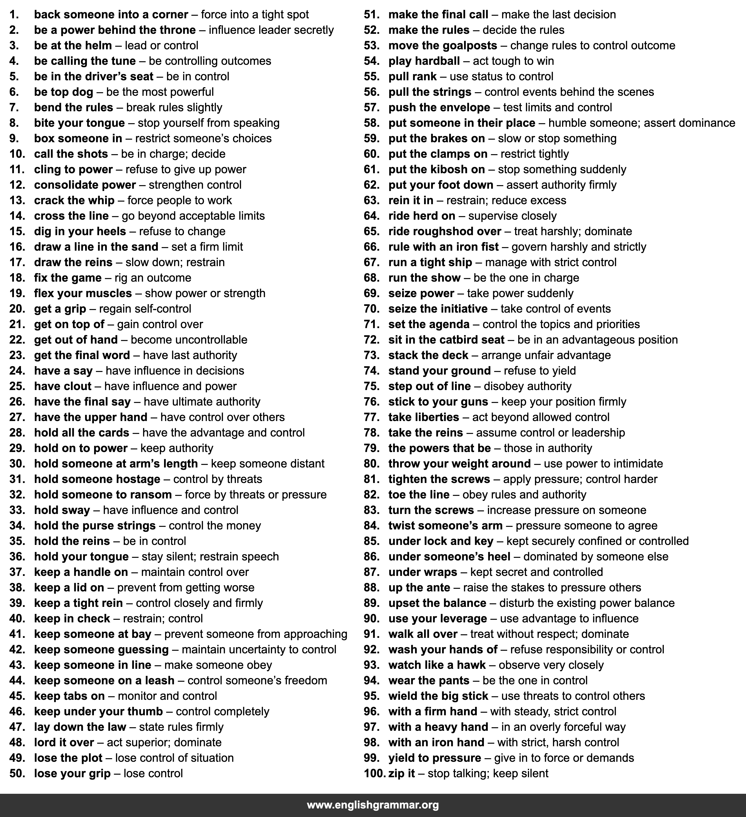 | 46. | keep under your thumb | control completely |
