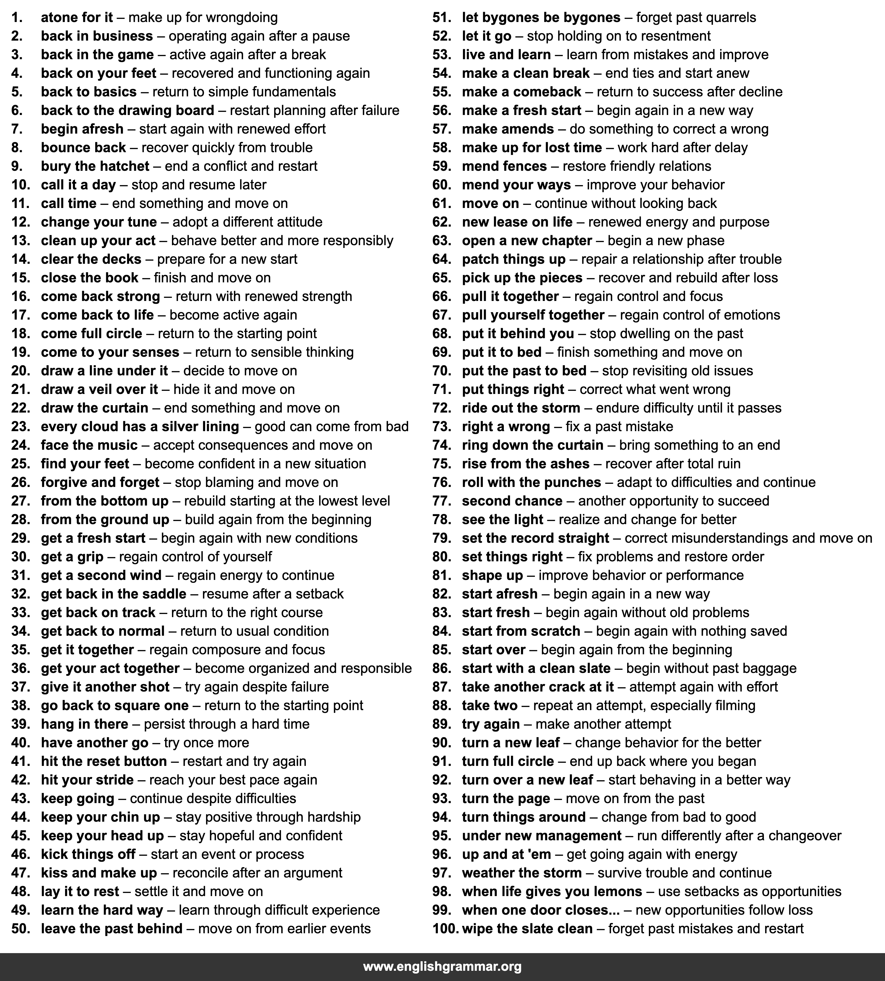 | 56. | make a fresh start | begin again in a new way |