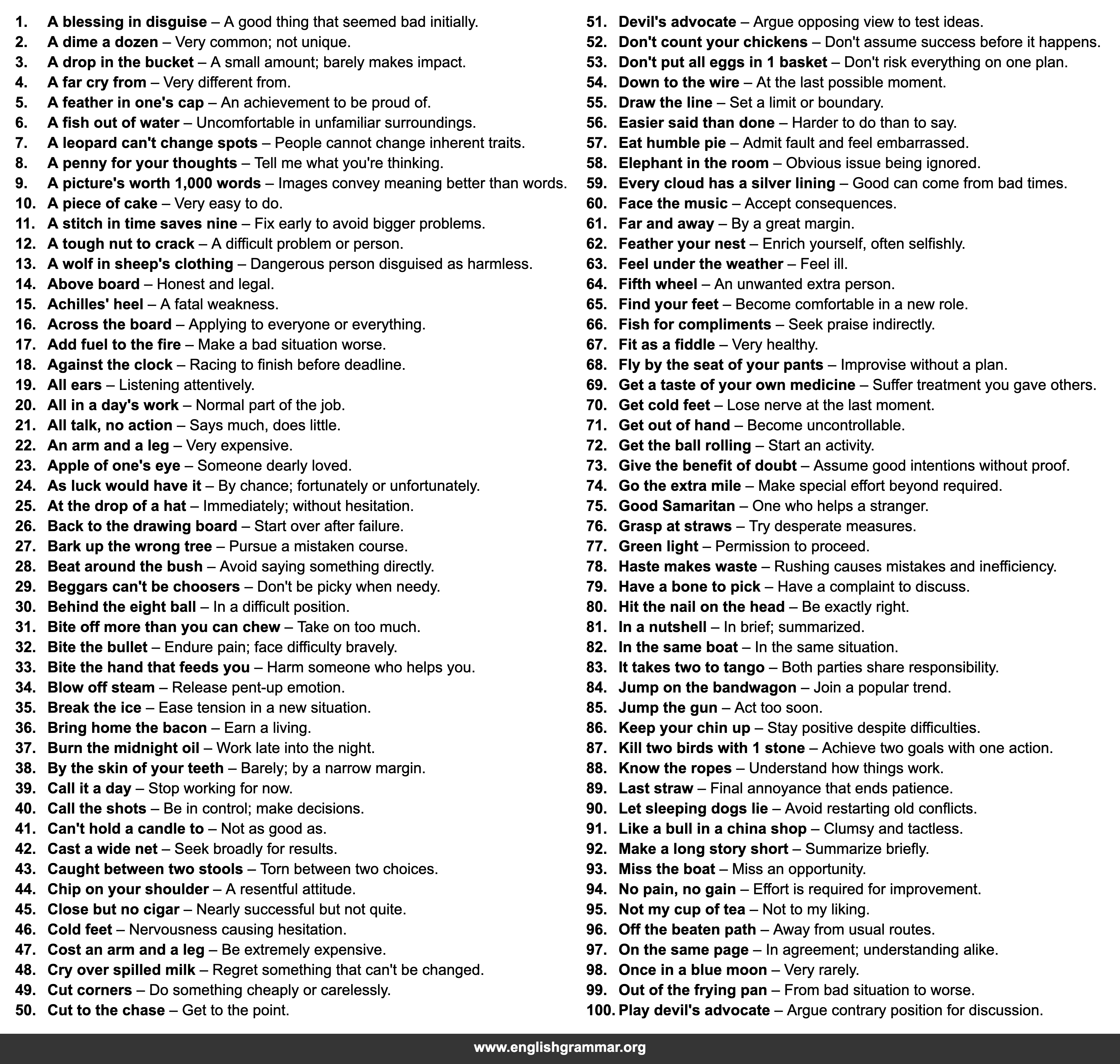 | 29. | Beggars can’t be choosers | Don’t be picky when needy. |