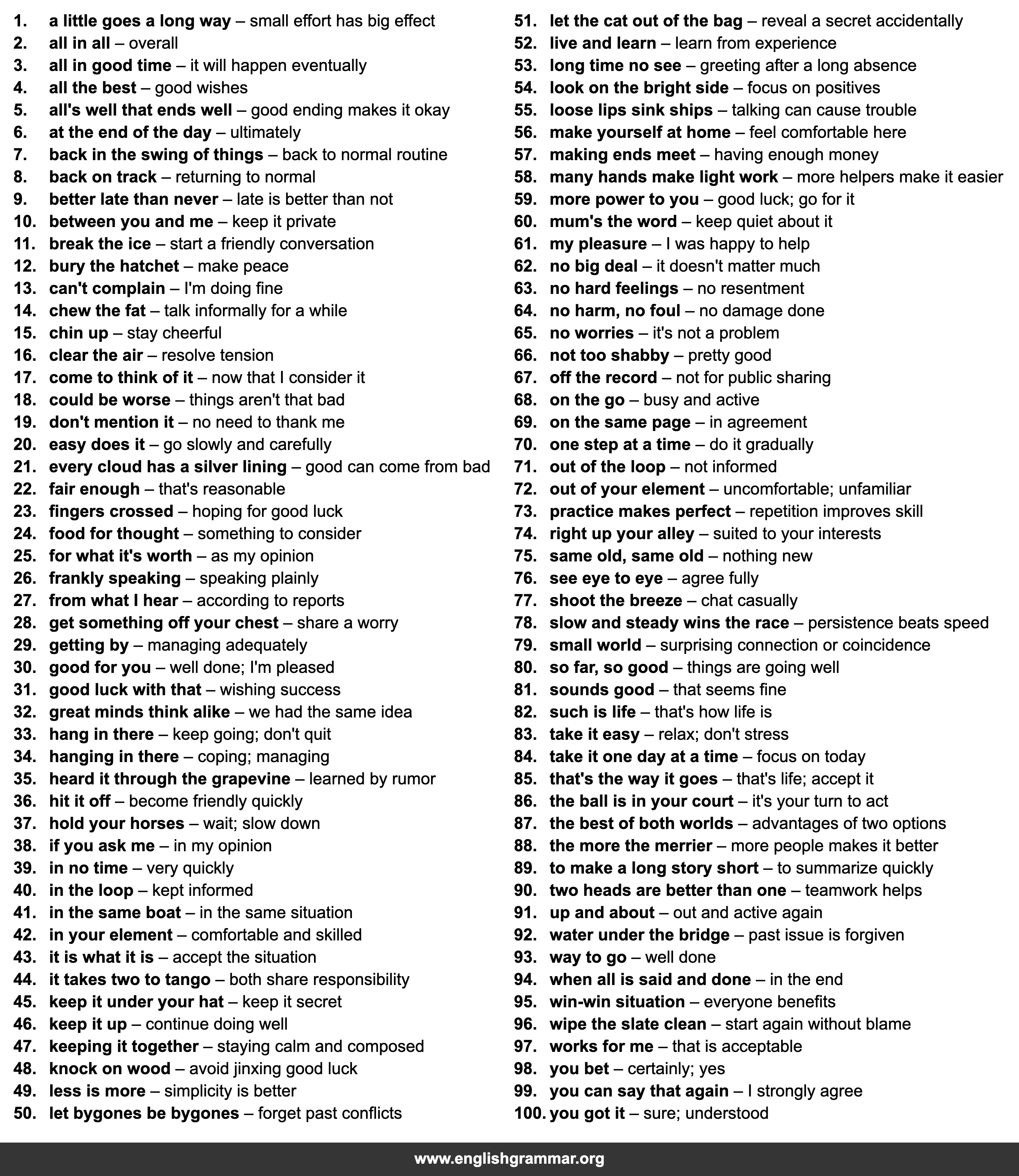 | 33. | hang in there | keep going; don’t quit |