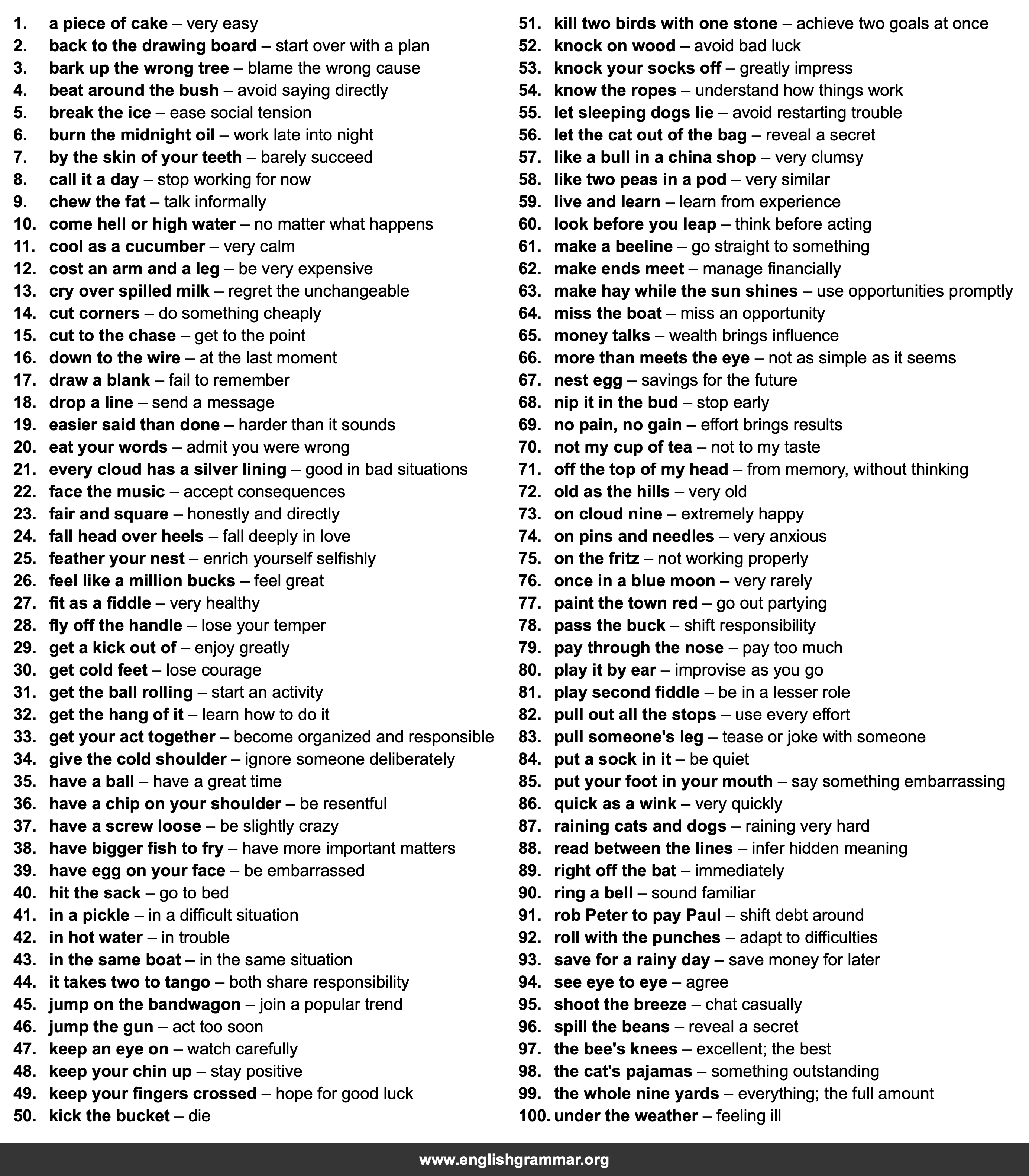 | 100. | under the weather | feeling ill |