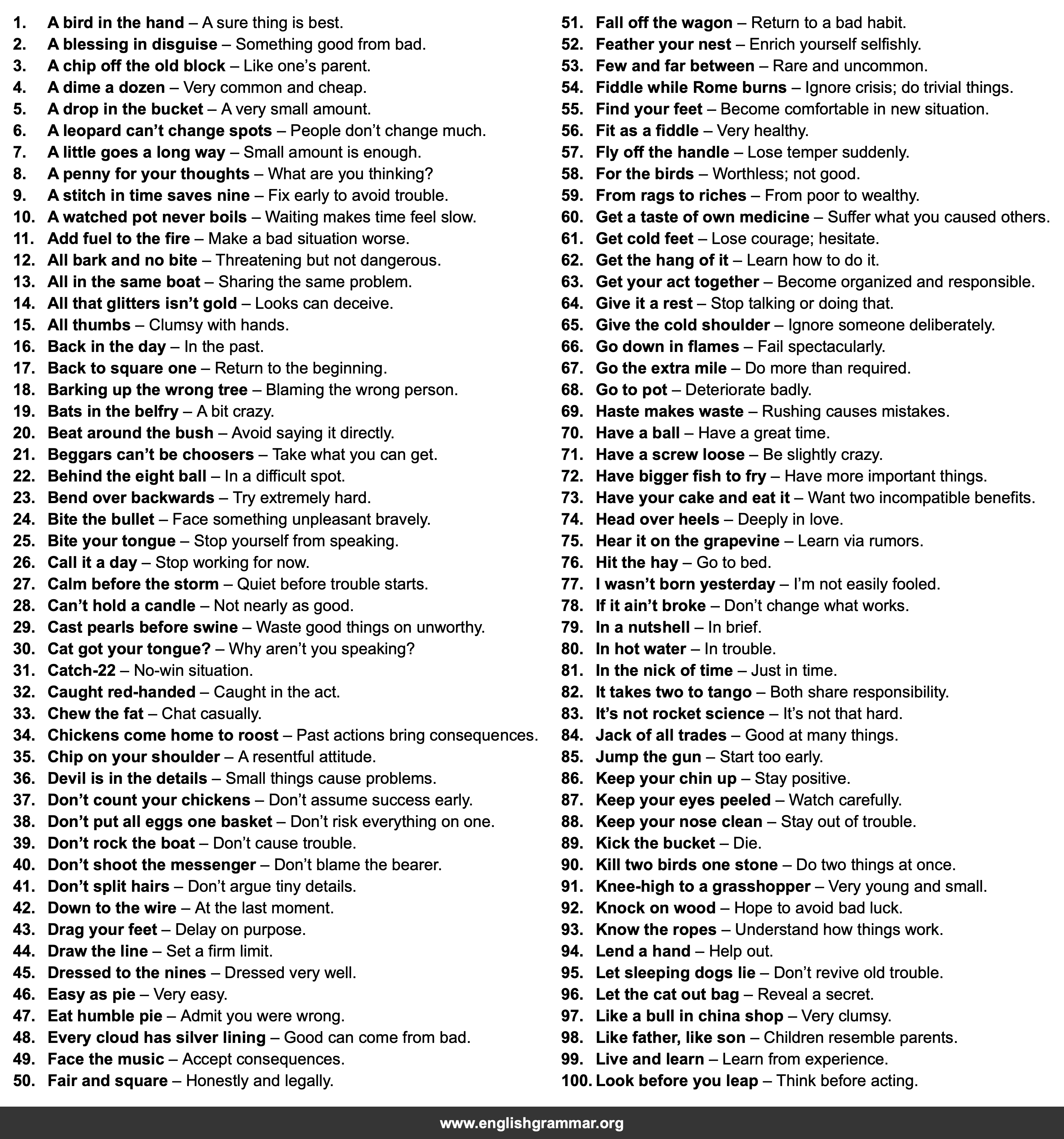 | 100. | Look before you leap | Think before acting. |