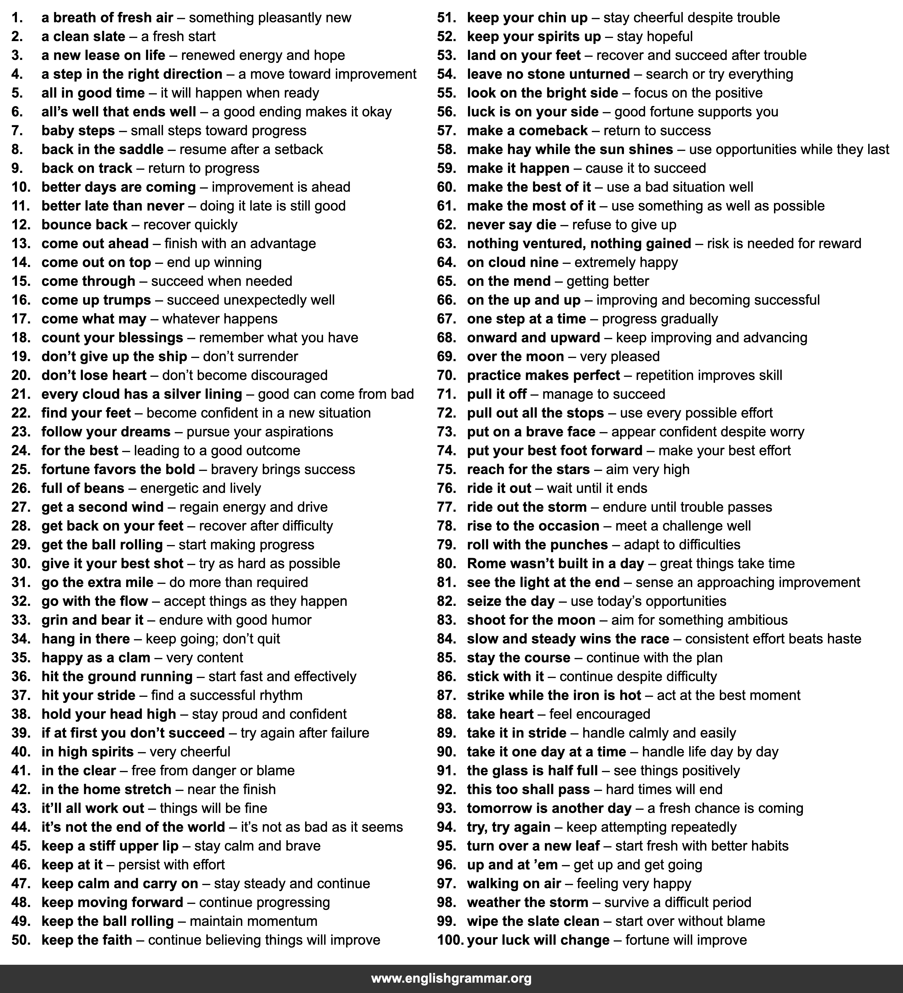 | 51. | keep your chin up | stay cheerful despite trouble |