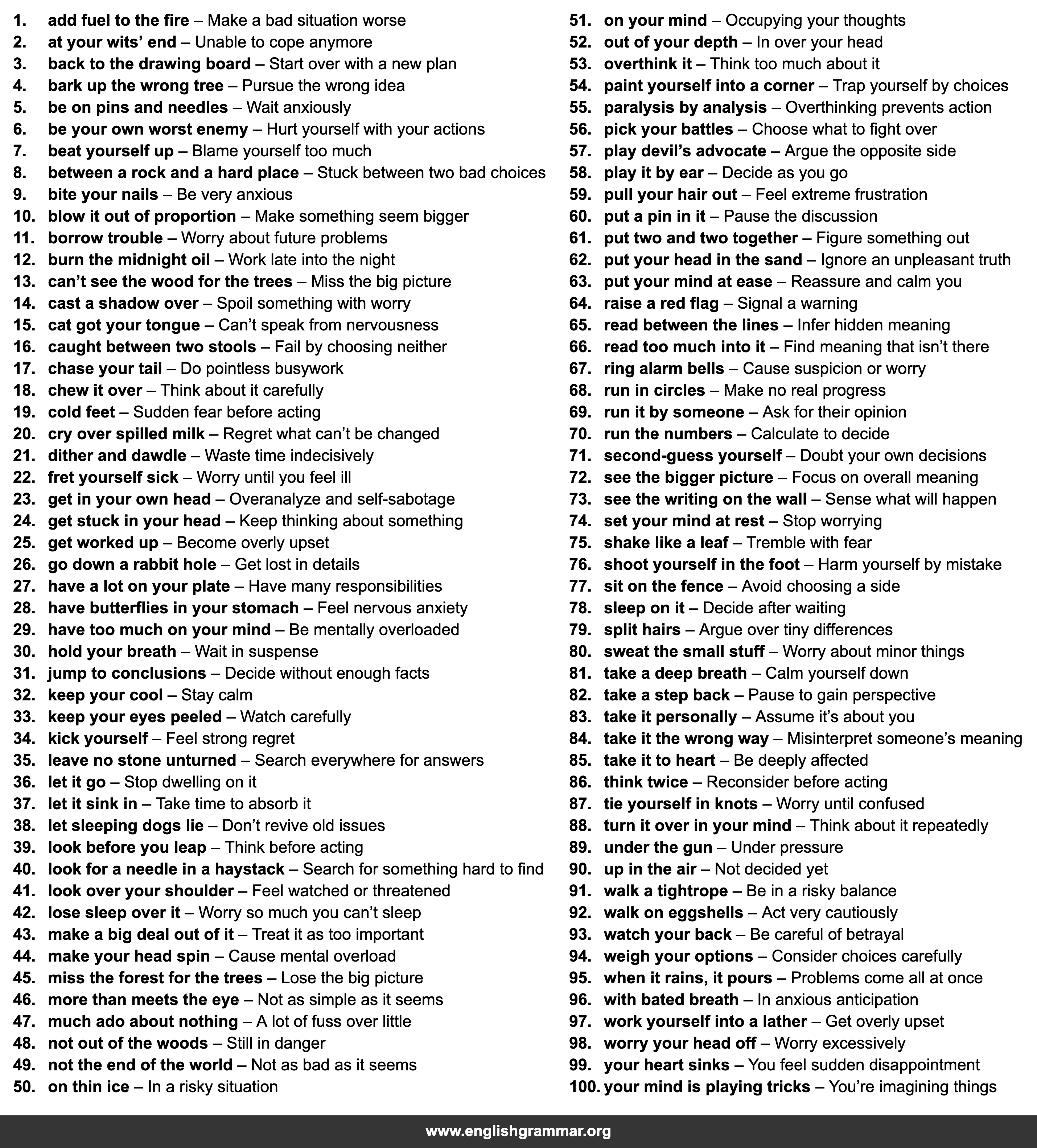 | 98. | worry your head off | Worry excessively |