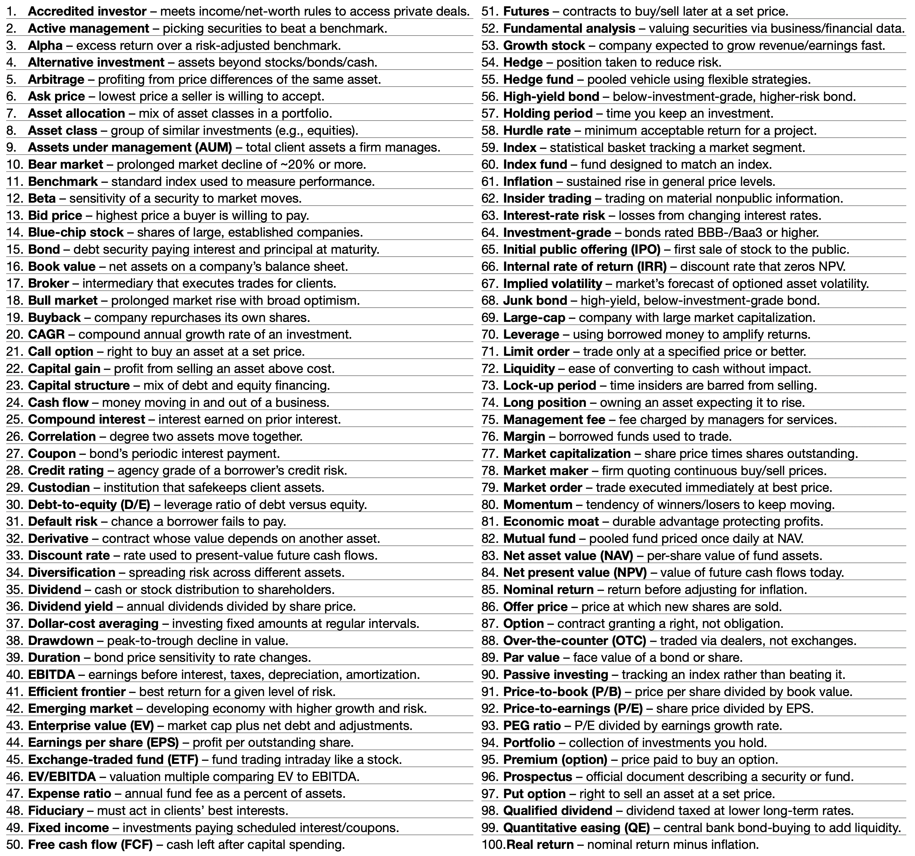 | 100. | Real return | Nominal return minus inflation. |