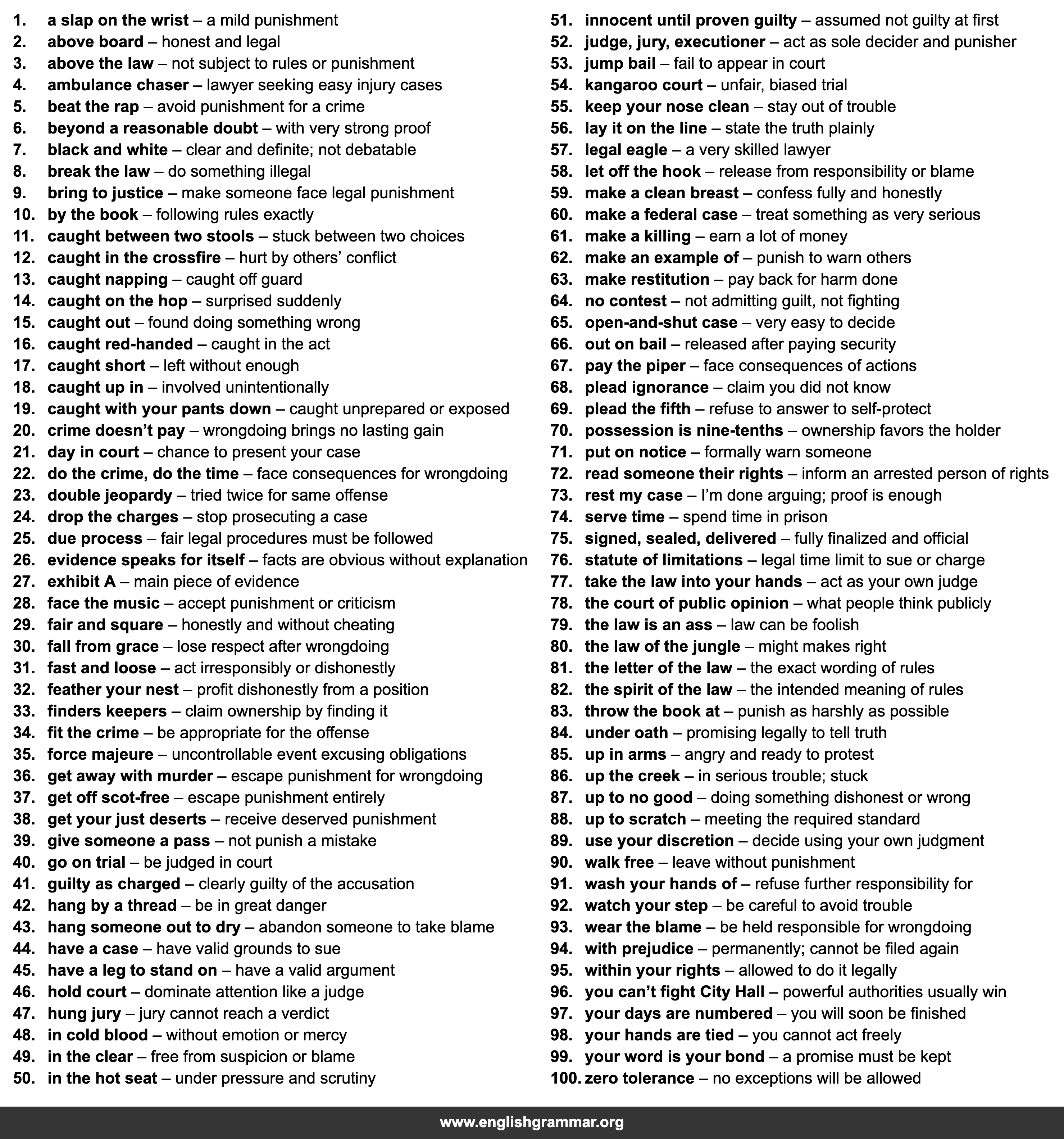 | 20. | crime doesn’t pay | wrongdoing brings no lasting gain |