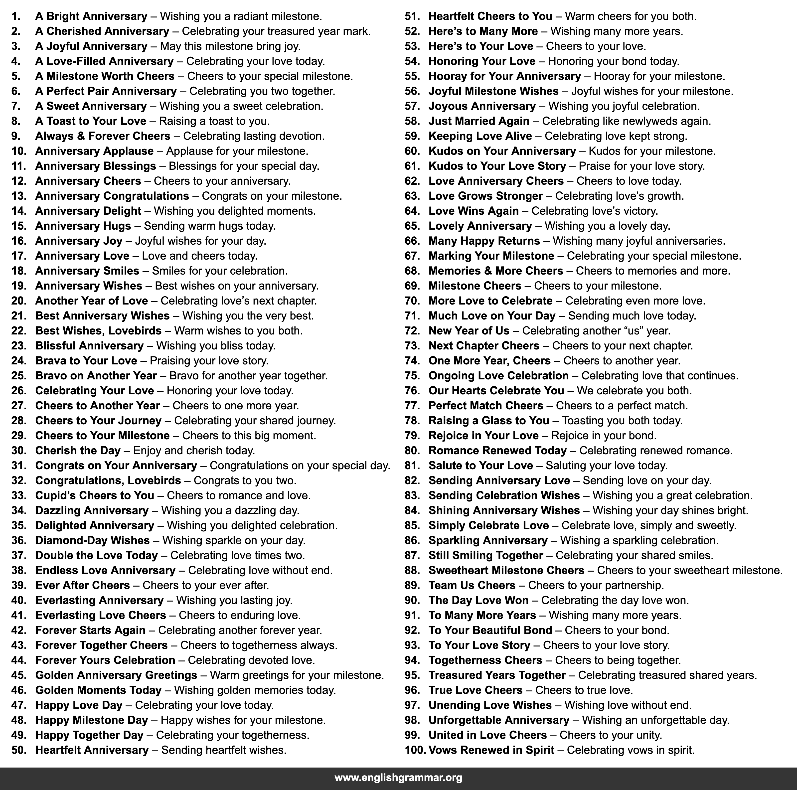 | 1. | A Bright Anniversary | Wishing you a radiant milestone. |